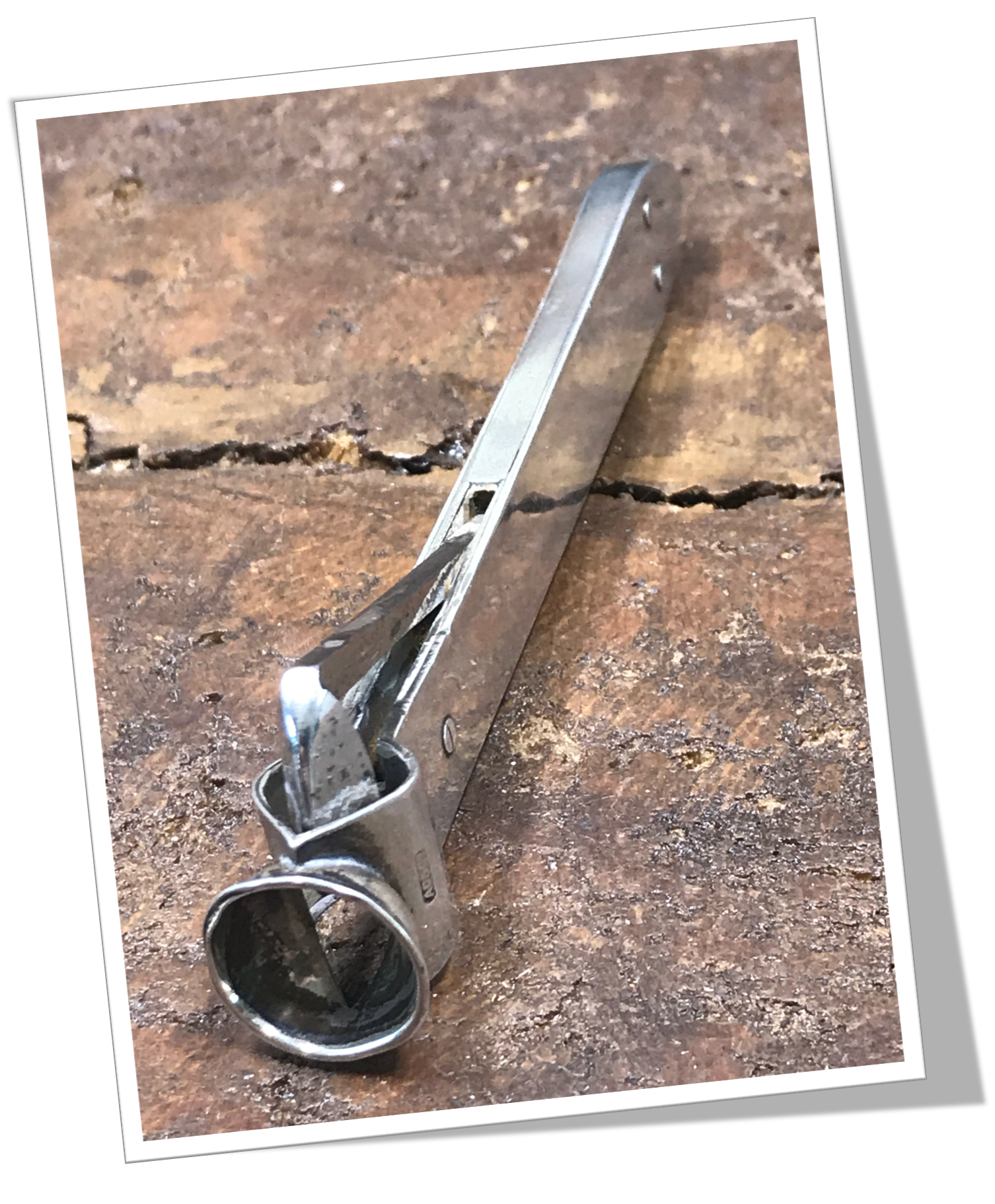 Coupe-Cigare de table Côtes lisses, pointues et rivetées en argent 925.En acier. Manche long à talon pointu, agrémenté d’une tête ancienne de type Cat-Eye (V-Cut), rehaussée d’un bouton circulaire. 12cm.