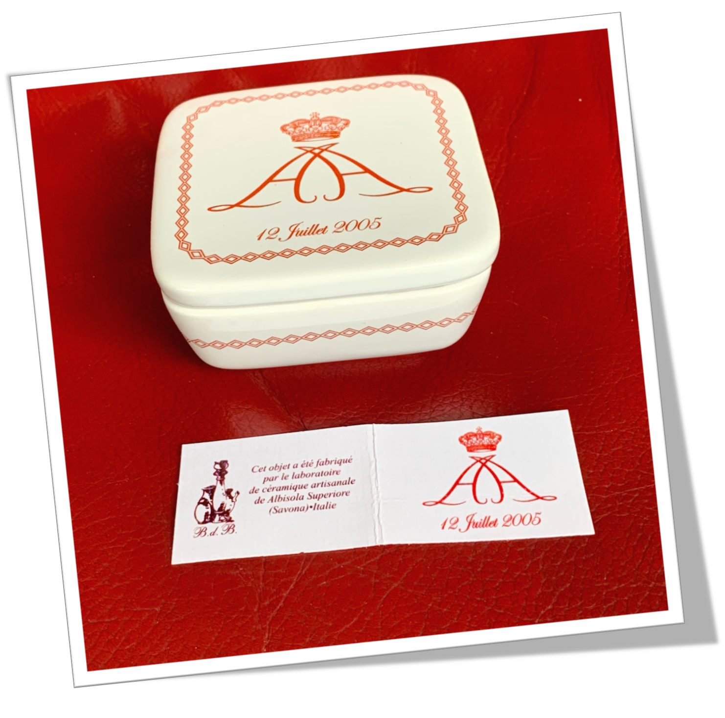 Souvenir du 10eme anniversaire du couronnement du Prince Albert II de Monaco, le 12 juillet 2005. Avec son attestation d’origine, mentionnant au recto: « Série limitée offerte par S.A.S Le Prince Albert II de Monaco. Tirage 4300 exemplaires. Exemplaire n*1228 ». Et au verso: « cet objet a été fabriqué par le laboratoire de céramique artisanale Albisolia Superiore (Savona) Italie » et le double « AA » orné de la couronne ducale » ainsi que la date du 12 juillet 2005. Étui dunhill ?!