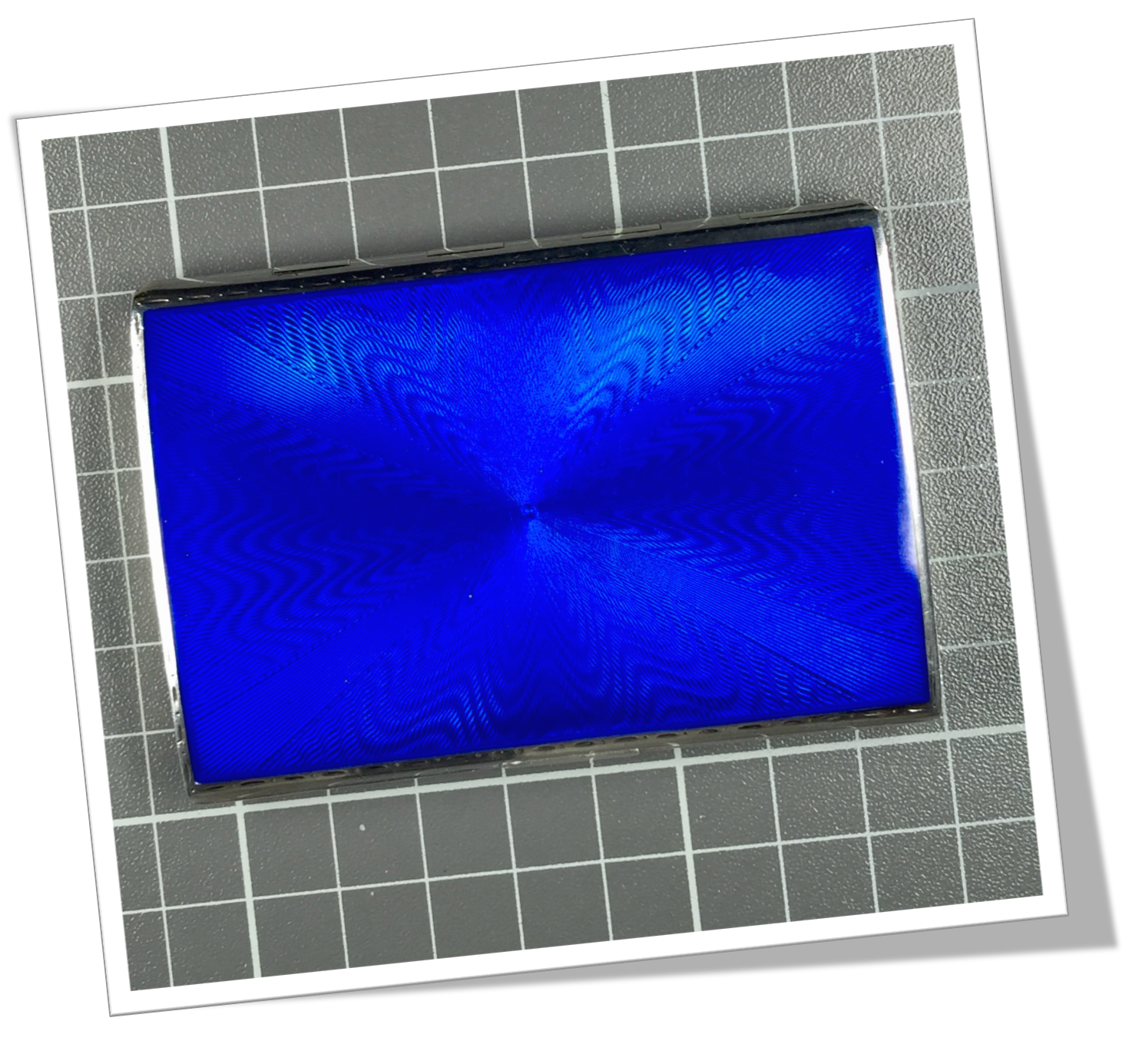 En argent 925 et de forme rectangulaire. Guillochage « rayonnant soleil » de style Art Deco. Émaillage bleu au recto. Côtés ciselés. Intérieur gilt « vermeil ».