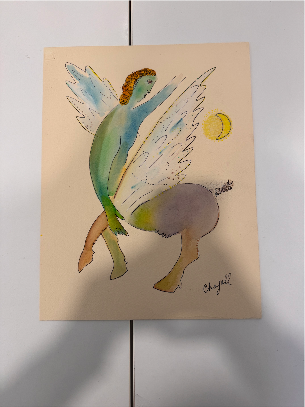 Dessin aquarelle Un dessin à l’aquarelle surréaliste d’un homme, d’un ange, signé Chagall. Il s’agit d’une œuvre joliment colorée réalisée dans un mélange saisissant de tons d’aquarelle qui capture l’essence du style fantastique de rêve visuellement expressif de Chagall. Il a été soigneusement inspecté pour s’assurer qu’il ne s’agit pas d’une impression et qu’il s’agit d’une véritable peinture à l’aquarelle sur papier. Sans provenance viable, il s’est donc vendu comme après Chagall et tel qu’il a été inspecté visuellement.
