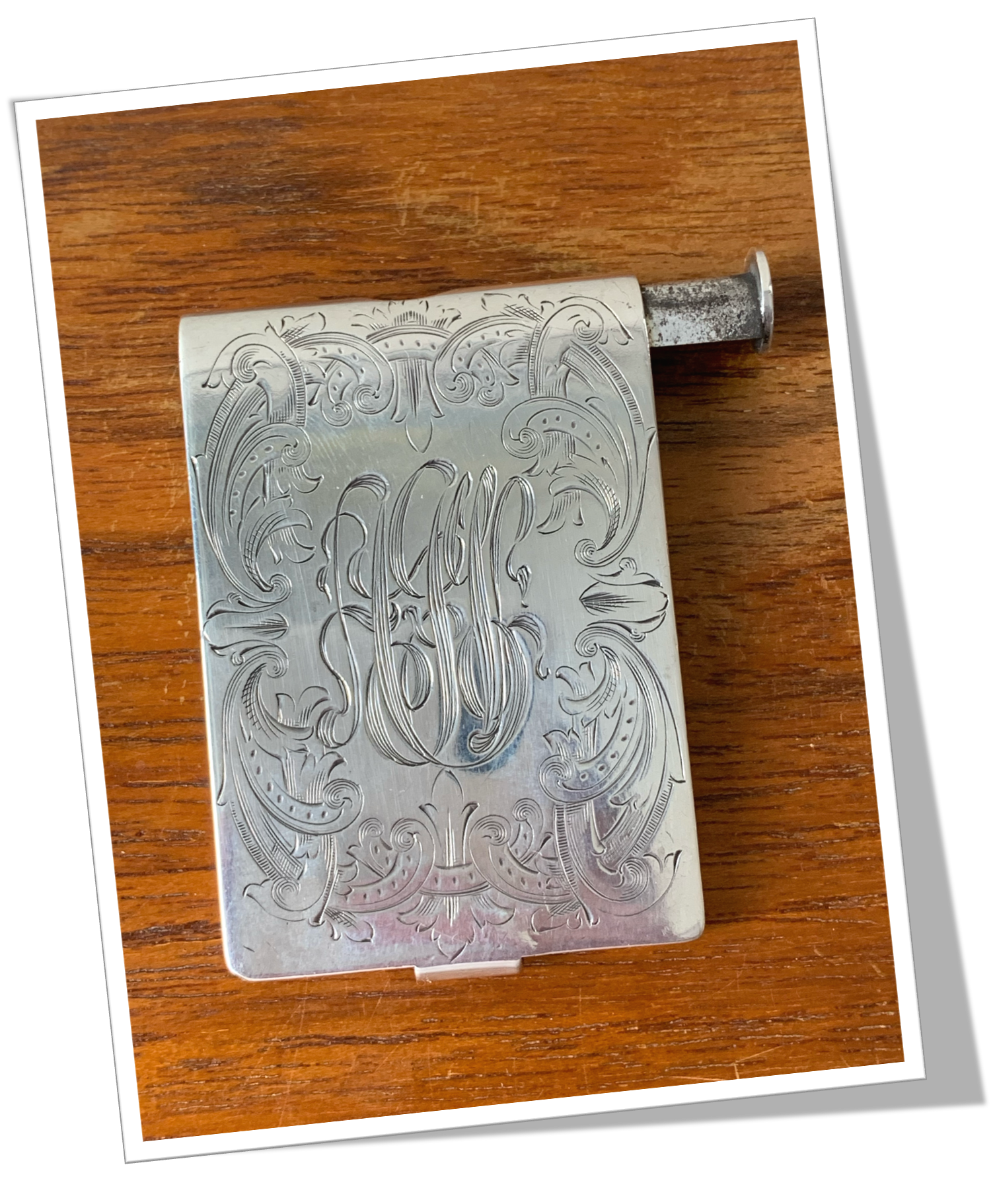 En argent 925 et de forme rectangulaire, rehaussé au recto de rinceaux ciselés, agrémentés du monogramme « AGV ». 44g.