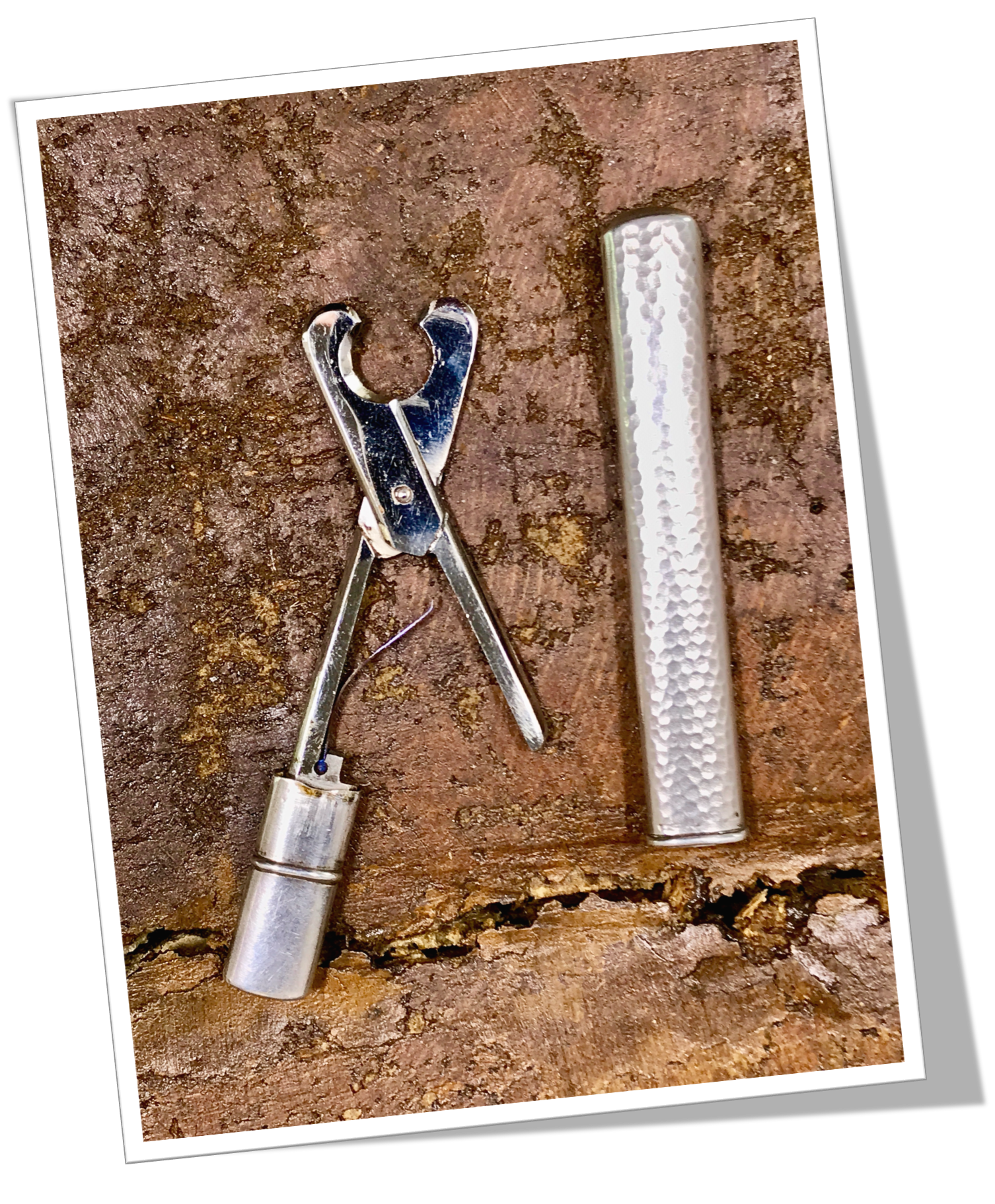 Coupe-Cigare de poche Fourreau en argent 830, rehaussé d’un guillochis « martelé ».Sécateur pliable niché à l’intérieur. 8cm.