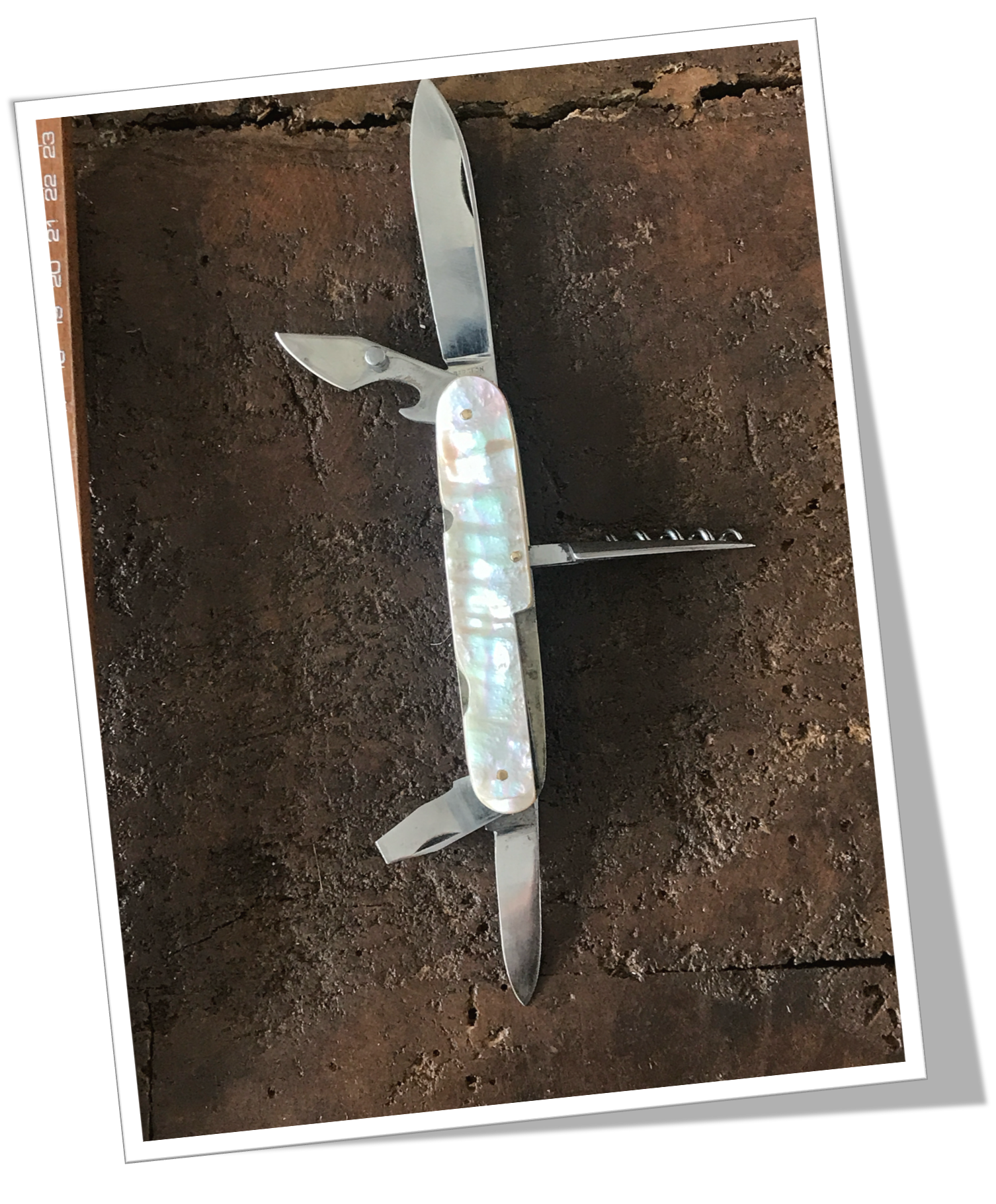 Couteau navette Manche à côtes ovoïdes rivetées en nacre.6pcs: Grande lame, petite lame, tournevis, ouvre boîte, pique poinçon et tir bouchon. 15cm