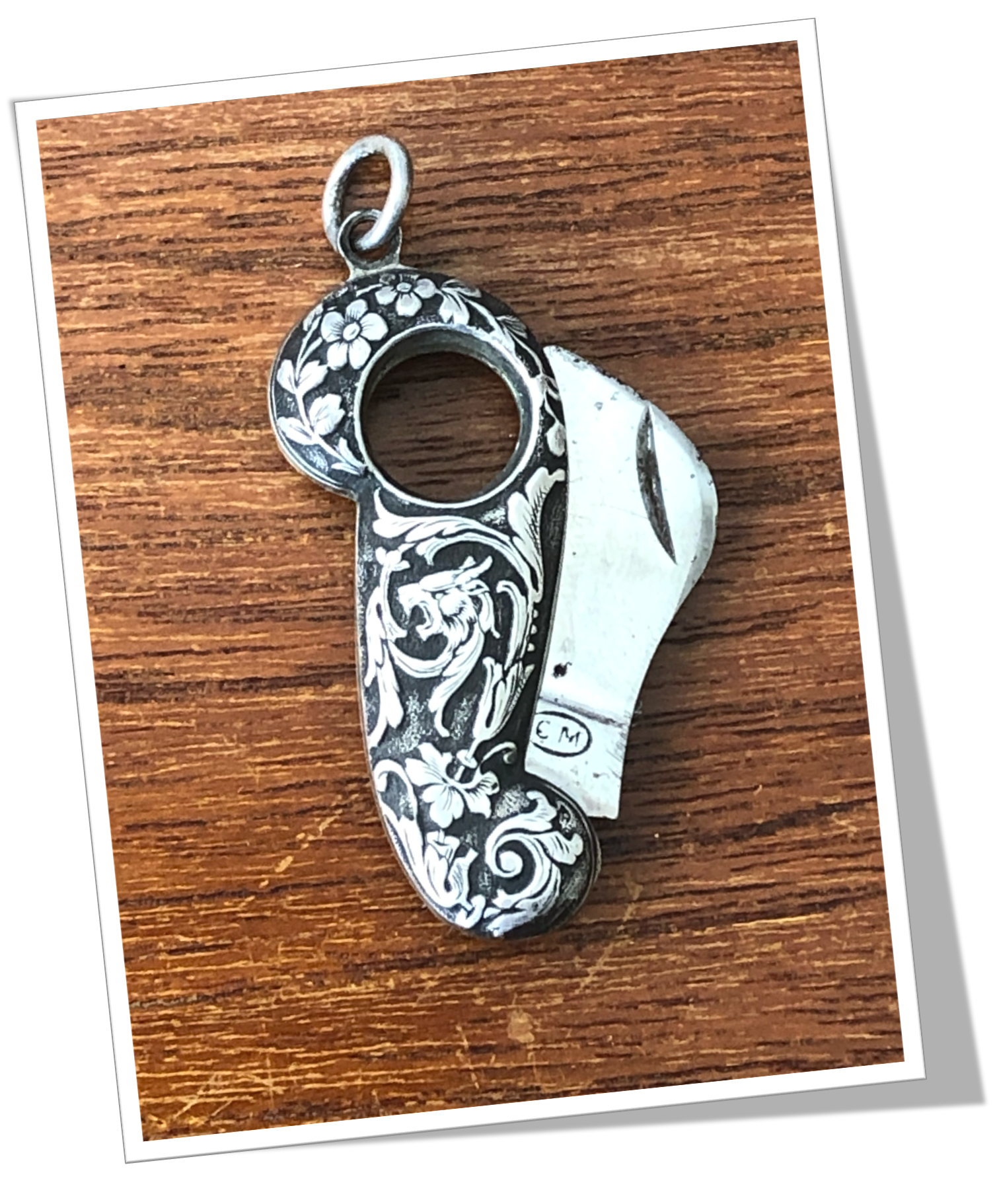 Coupe-Cigare de poche Corne d’abondance à côtes appliquées en argent 925 niellé. Chimère lion et ornements de style Art Nouveau, en technique « repoussé ».Lame guillotine à ressort. Bélière.