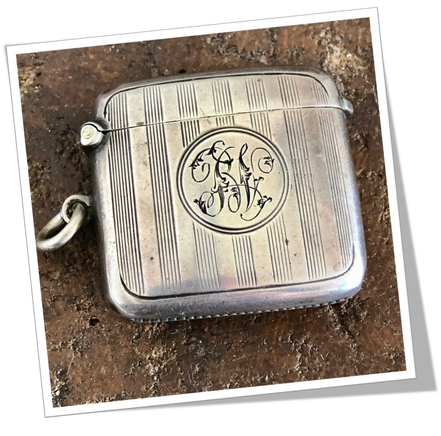 En argent 925 et de forme carré. Rehaussé d’un guillochis « strié fin » en bandelettes et agrémenté au recto d’un cartouche circulaire au monogramme « BV ». De style Art Deco.