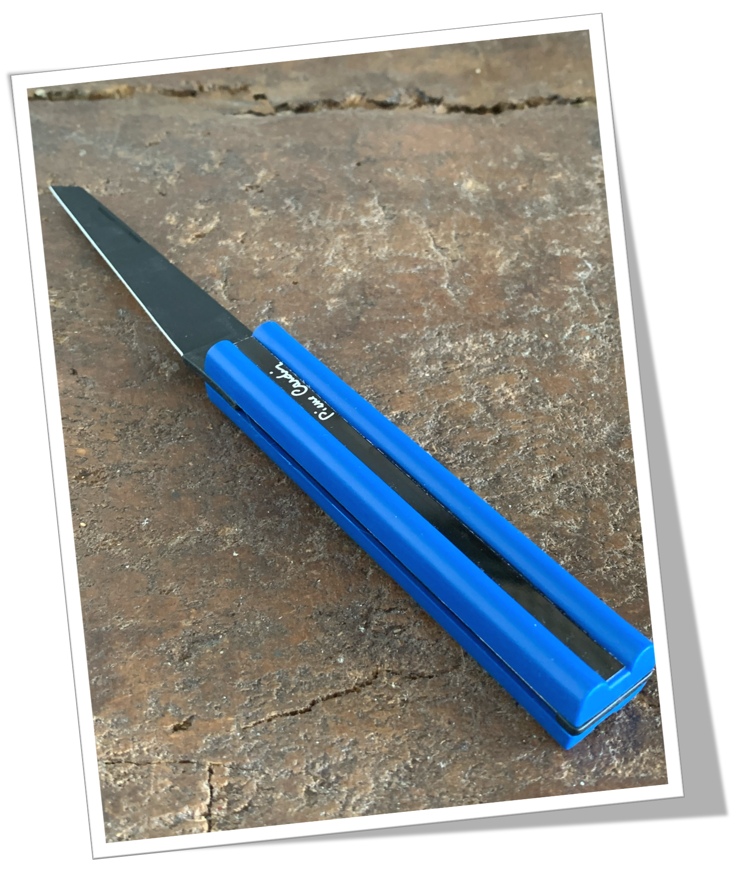 Couteau navette Manche à côtes angulaires appliquées en métal noir galvanisé. Liseré bleu YSL Saint Laurent.1pcs: Lame. 15cm.