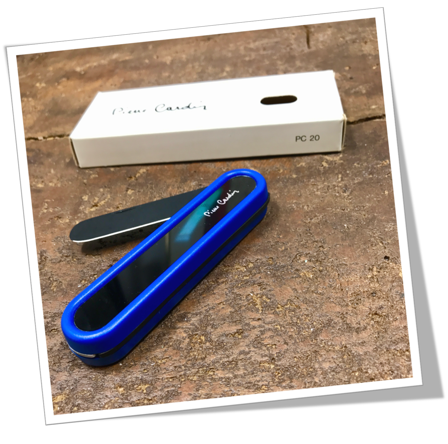 Couteau navette Manche à côtes ovoïdes appliquées en métal noir galvanisé. Liseré en résine bleu YSL Saint Laurent.2pcs: Lame noire et lime. 15cm.