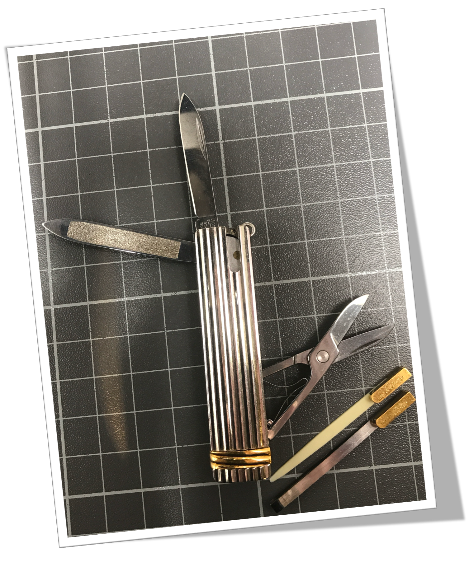 Couteau canif suisse Manche à côtes angulaires appliquées en métal argenté. guillochis « godronné ». Anneau trinité en métal doré.3pcs+: lame, lime et ciseaux pliants +2pcs: cure-dents et pince à épiler extractibles. Anneau. 9cm.