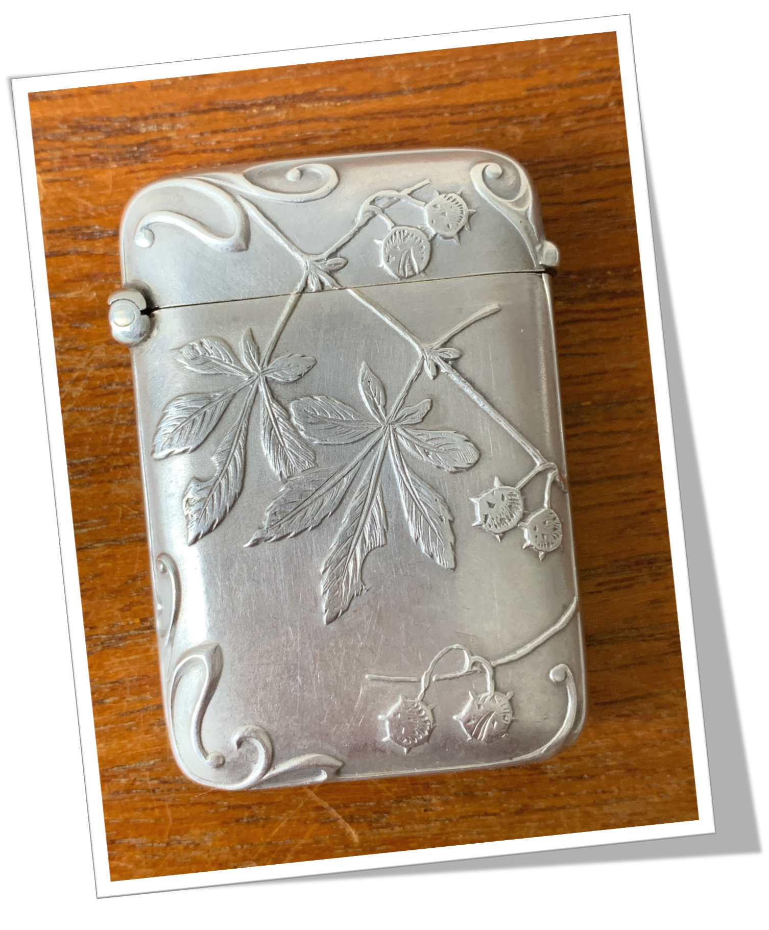 Pyrogène Vesta Case En argent 925 et de forme rectangulaire. Rehaussé d’un ciselage de style Art Nouveau, de branches de châtaignier garnies de ses fruits et feuilles. 18,70gr.Clapet 1/5 4/5 et grattoir concave à la base.