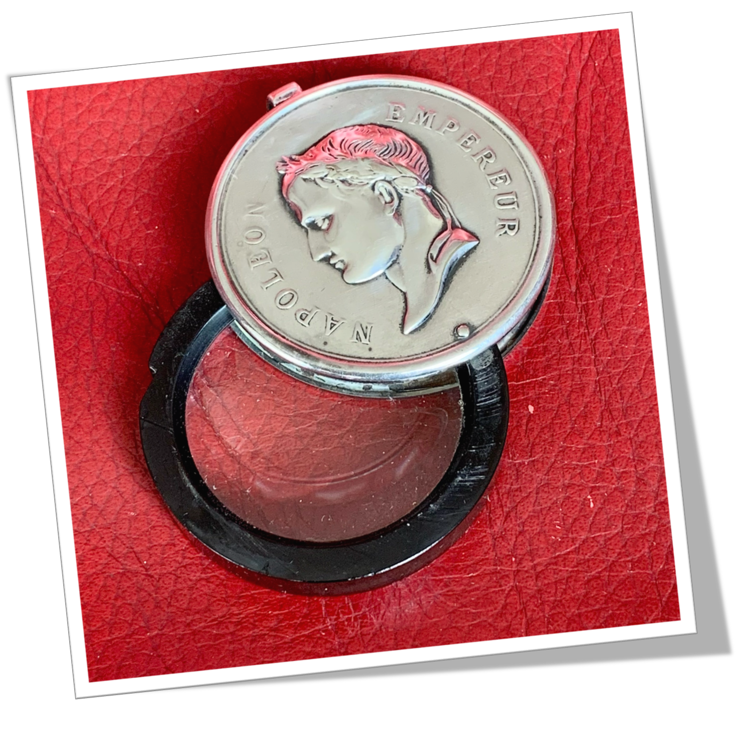 Loupe Médaille en métal argenté. Agrémenté au recto du buste de Napoléon Empereur et au verso, de feuilles de lauriers ornées de l’abeille impériale.Cache loupe. Verre grossissant.