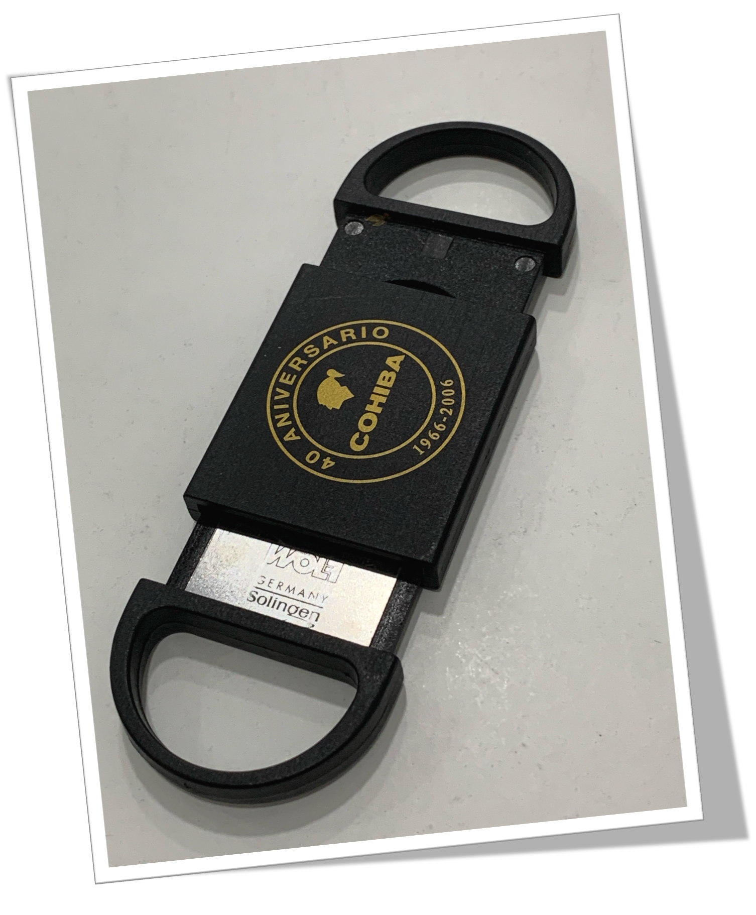 Coupe-Cigare de poche En résine noire, agrémenté d’une sérigraphie publicitaire dorée.Double prise semi-circulaires latérales. Hublot obstrué à l’avant. Double guillotine nichée à l’arrière. 8cm.
