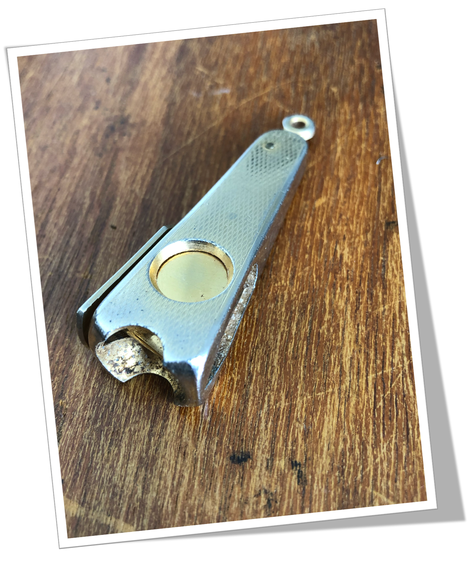 Coupe-Cigare de poche Côtes appliquées en métal doré, rehaussées d’un guillochis « linéaire ».En métal doré. Manche court agrémenté d’une tête moderne, de type Cut-Eye (V-Cut) + Straight-Cut et d’un anneau levier. 6cm.
