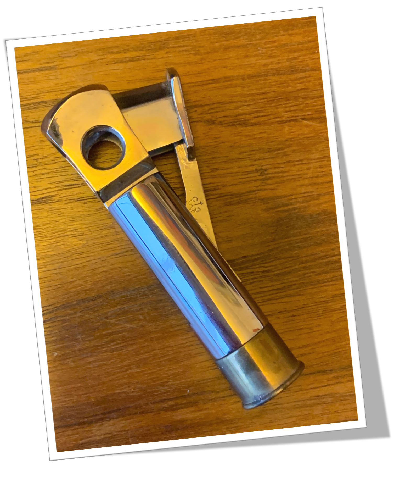 Coupe-Cigare de poche En acier chromé et laiton. Cylindrique avec en bout une cartouche de balle de chasse, vissée.En acier chromé. Manche court agrémenté d’une tête moderne, de type Cut-Eye (V-Cut) + Straight-Cut. 9cm.