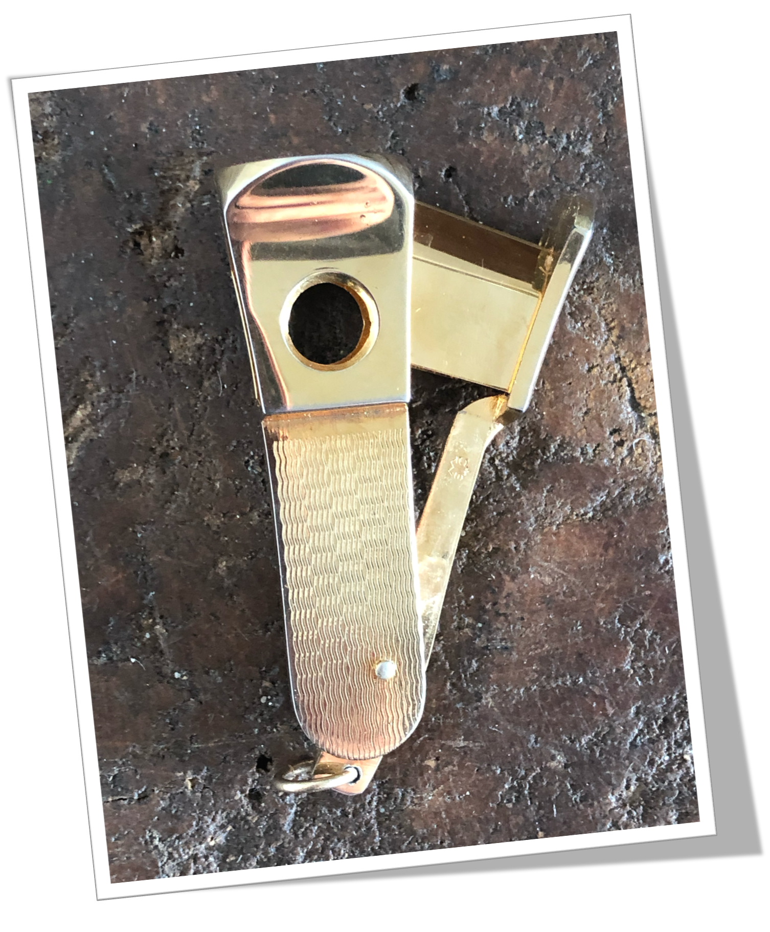 Coupe-Cigare de poche Côtes rivetées en métal doré, rehaussées d’un guillochis « cinétique ».En métal doré. Manche court agrémenté d’une tête moderne, de type Cut-Eye (V-Cut) + Straight-Cut et d’un anneau levier avec bélière. 6cm.