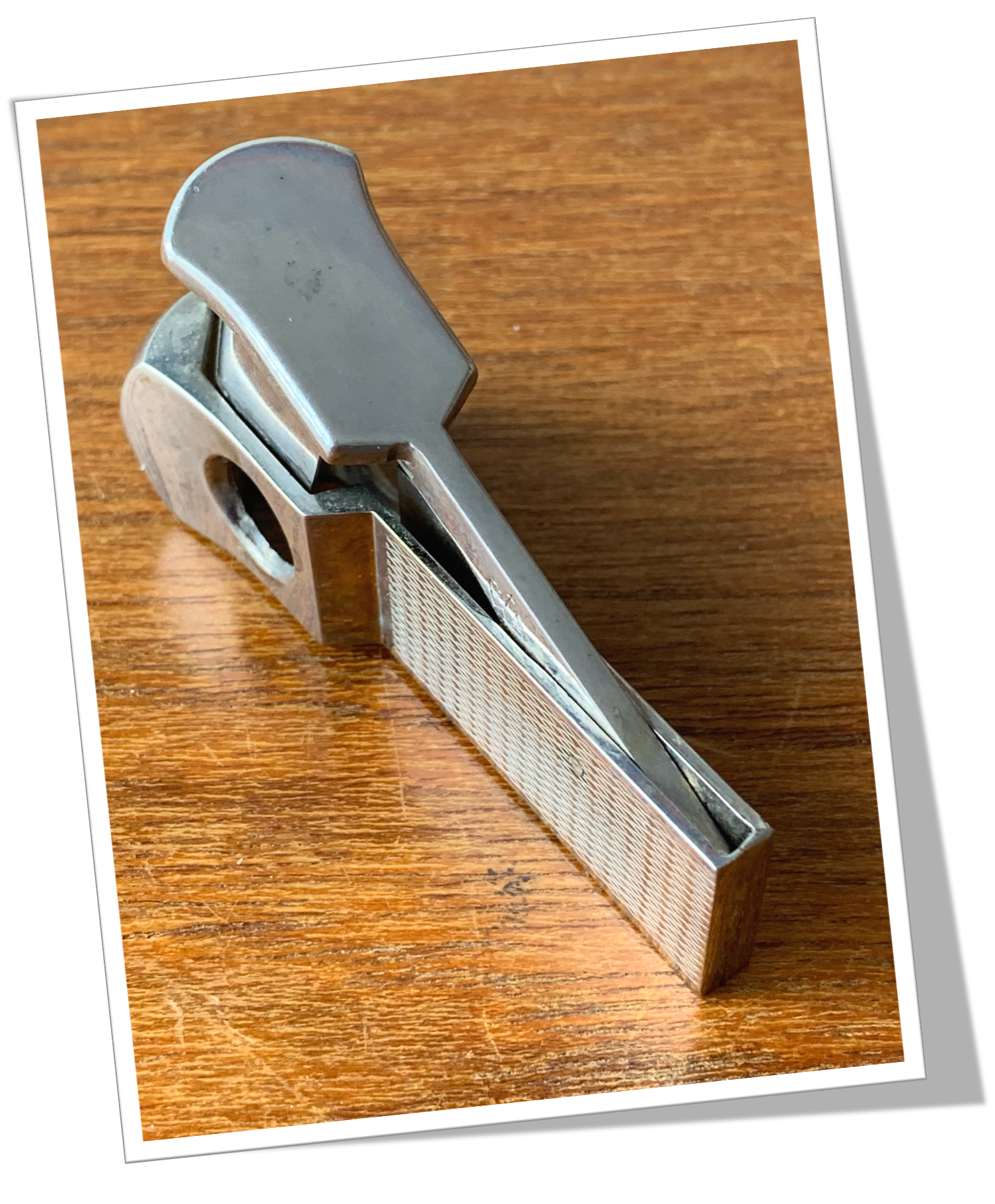 Coupe-Cigare de poche Côtes appliquées en métal argenté rehaussées d’un guillochis « linéaire », agrémenté d’un liseré.En acier chromé. Manche court agrémenté d’une tête moderne, de type Cut-Eye (V-Cut) + Straight-Cut. 6cm.