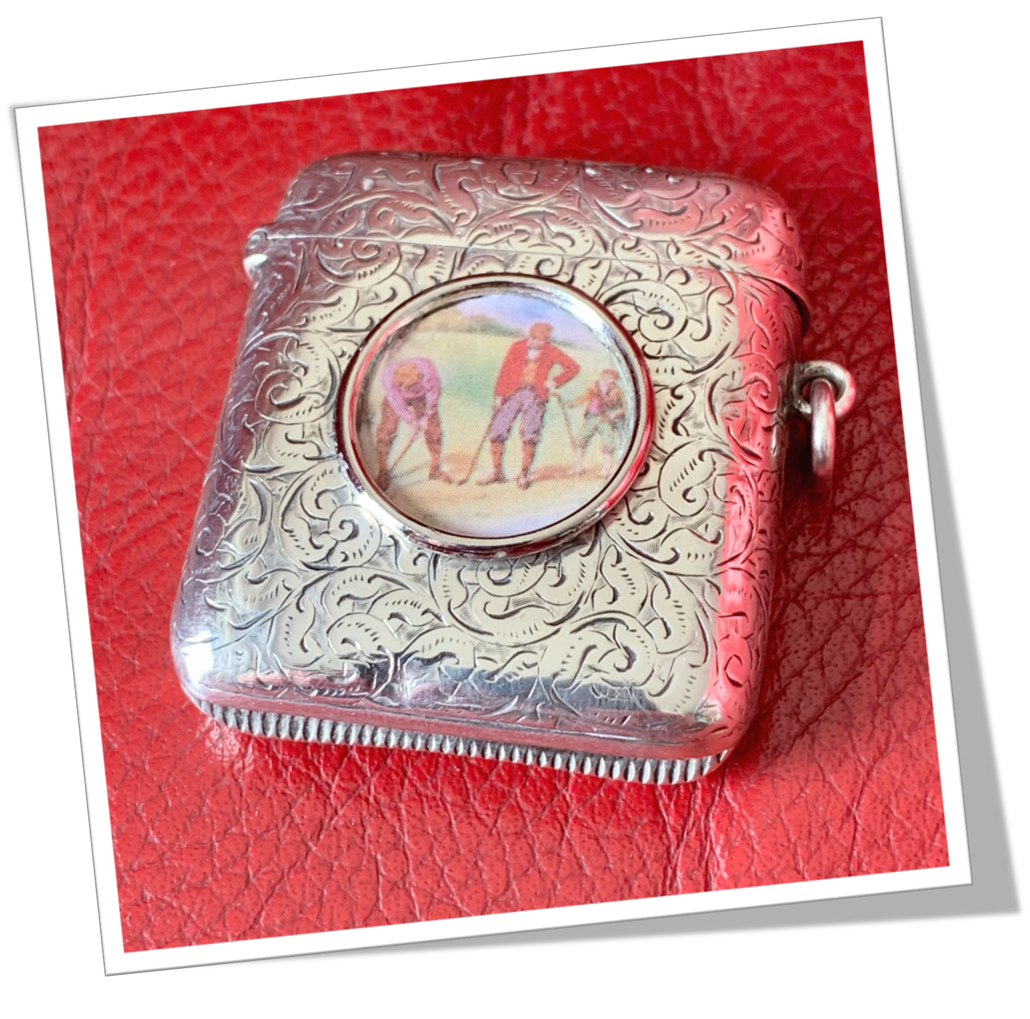 Pyrogène Vesta Case En argent 925 et de forme rectangulaire. Rehaussé de rinceaux ciselés de style Art Nouveau et, agrémenté au recto d’un médaillon émaillé et appliqué, représentant un golfeur en action. 29,6g.Clapet 1/5 4/5 et grattoir concave à la base. Bélière latérale.