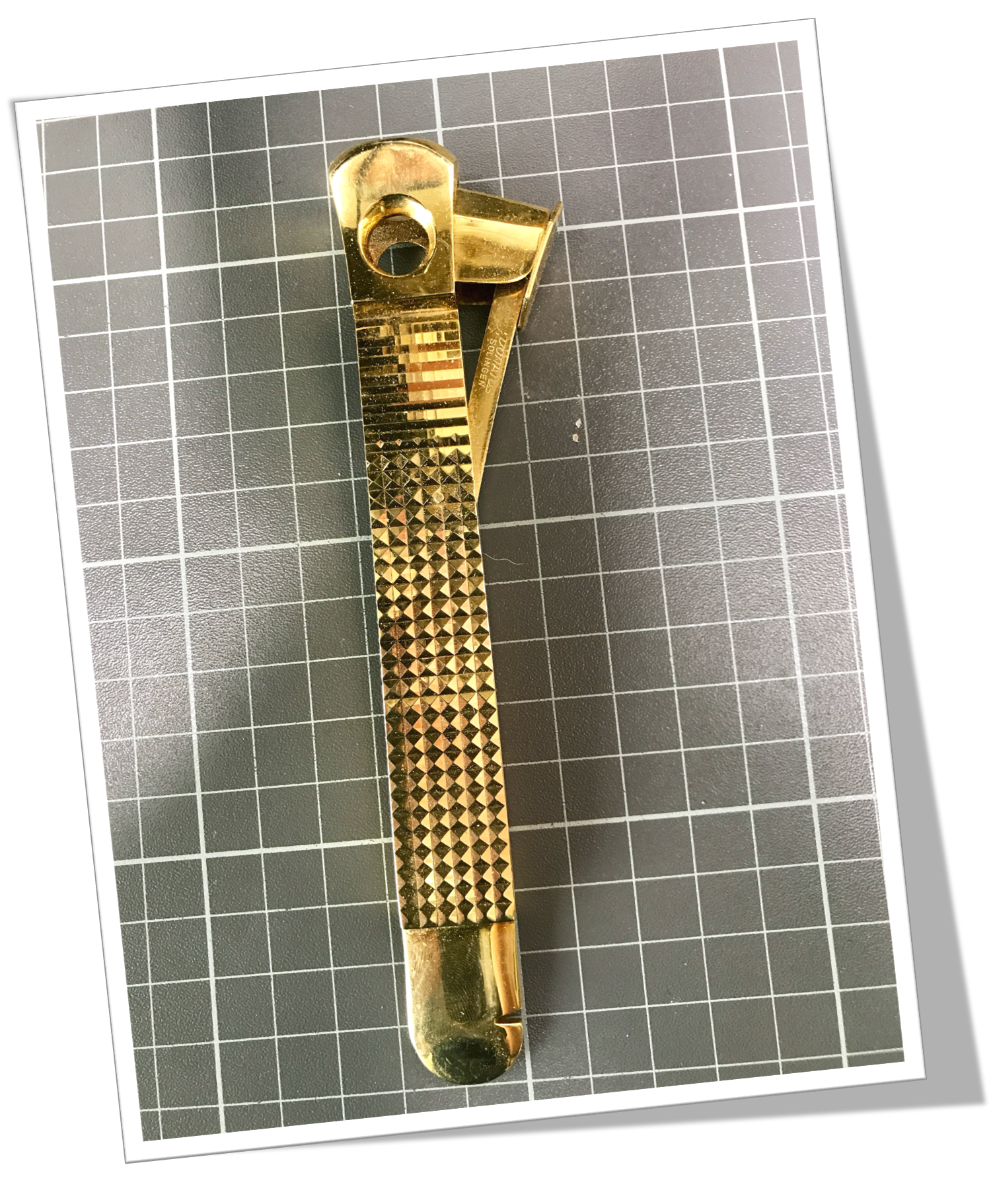 Coupe-Cigare de table Côtes appliquées en métal doré, rehaussées d’un gaufrage « gros diamant ».En métal doré. Manche long agrémenté d’un « pied de biche » et d’une tête moderne de type Cut-Eye (V-Cut) + Straight-Cut. 16cm.