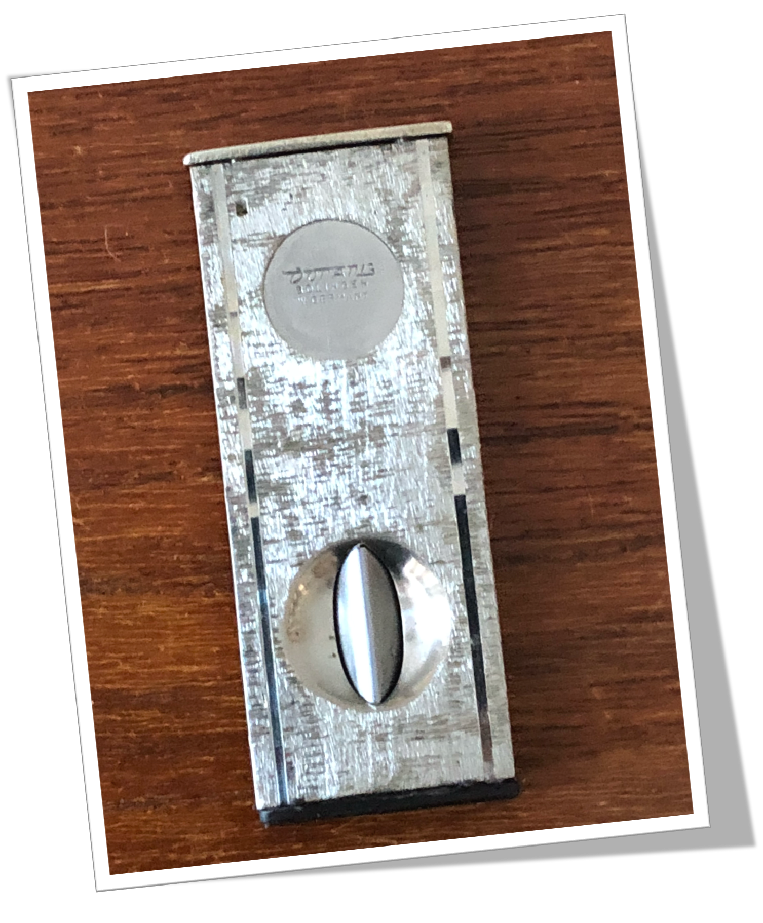 Coupe-Cigare de poche En métal argenté et de forme rectangulaire. Faces rehaussées d’un guillochis tramé « cinétique », agrémenté d’un liseré latéral.Cat-Eye (V-Cat) et guillotine à collerette.