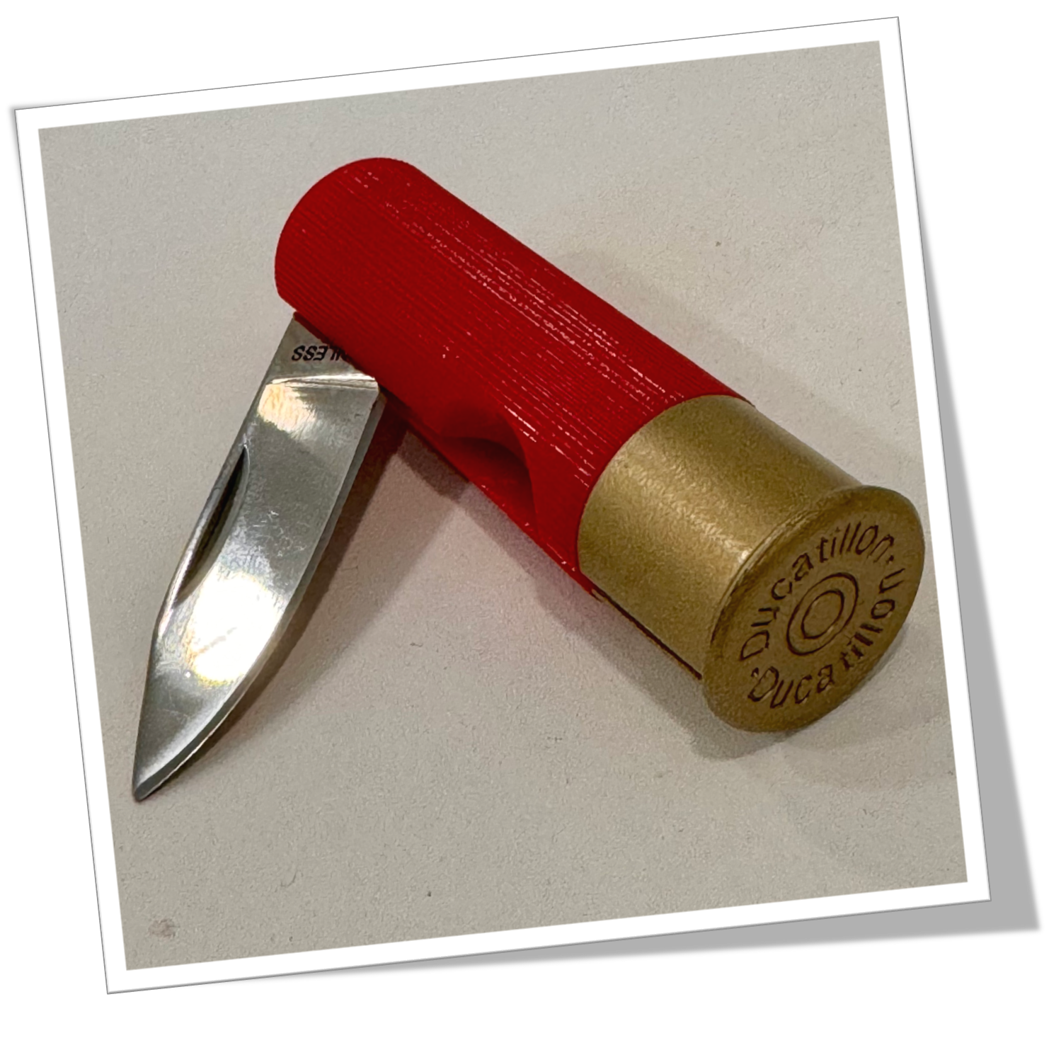 Couteau canif Manche en plastique, moulé et texturé en forme d’une cartouche d’un fusil de chasse. 1pcs: Grande lame. 12cm.