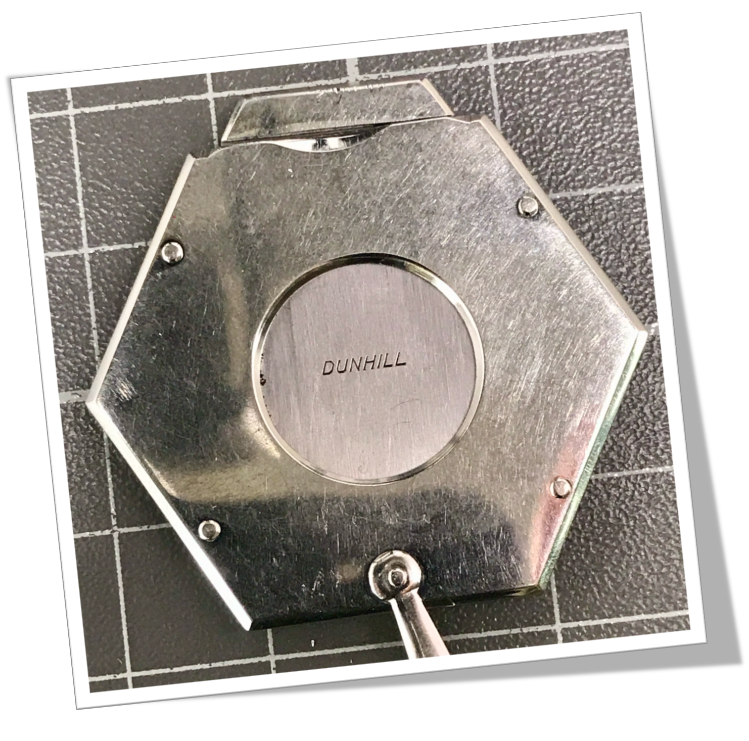 Coupe-Cigare de poche Côtes hexagonales rivetées en acier chromé, lisse poli miroir.Guillotine à collerette. Bélière.