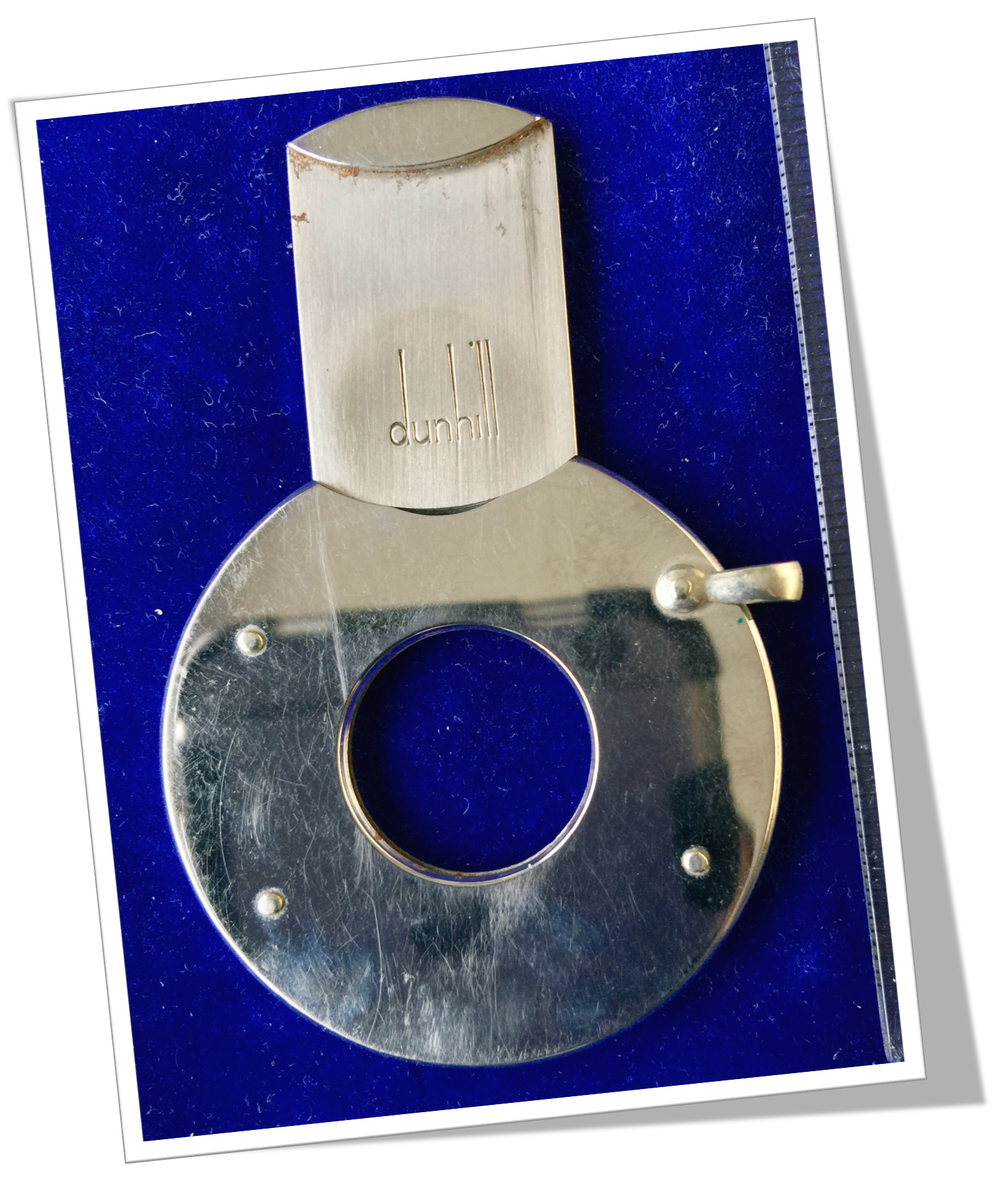 Coupe-Cigare de poche Côtes circulaire rivetées en acier chromé lisse poli miroir. Guillotine à tirette. Bélière latérale.