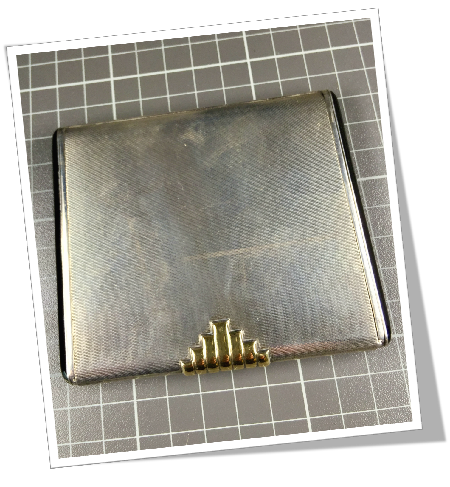 En argent 925. De forme carré, guillochage « linéaire » décoration en or appliquée au recto. Côtés laqués noir en laque de Chine. Intérieur poli miroir. De style Art Deco.