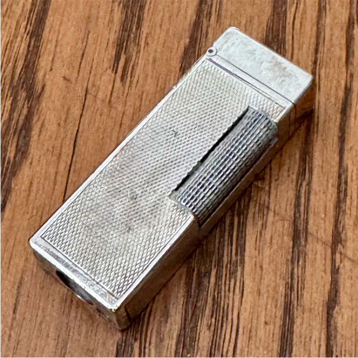 Briquet de poche En métal argenté et de forme rectangulaire. Guillochage « linéaire ». Mécanisme de mise à feu automatique. Réservoir.