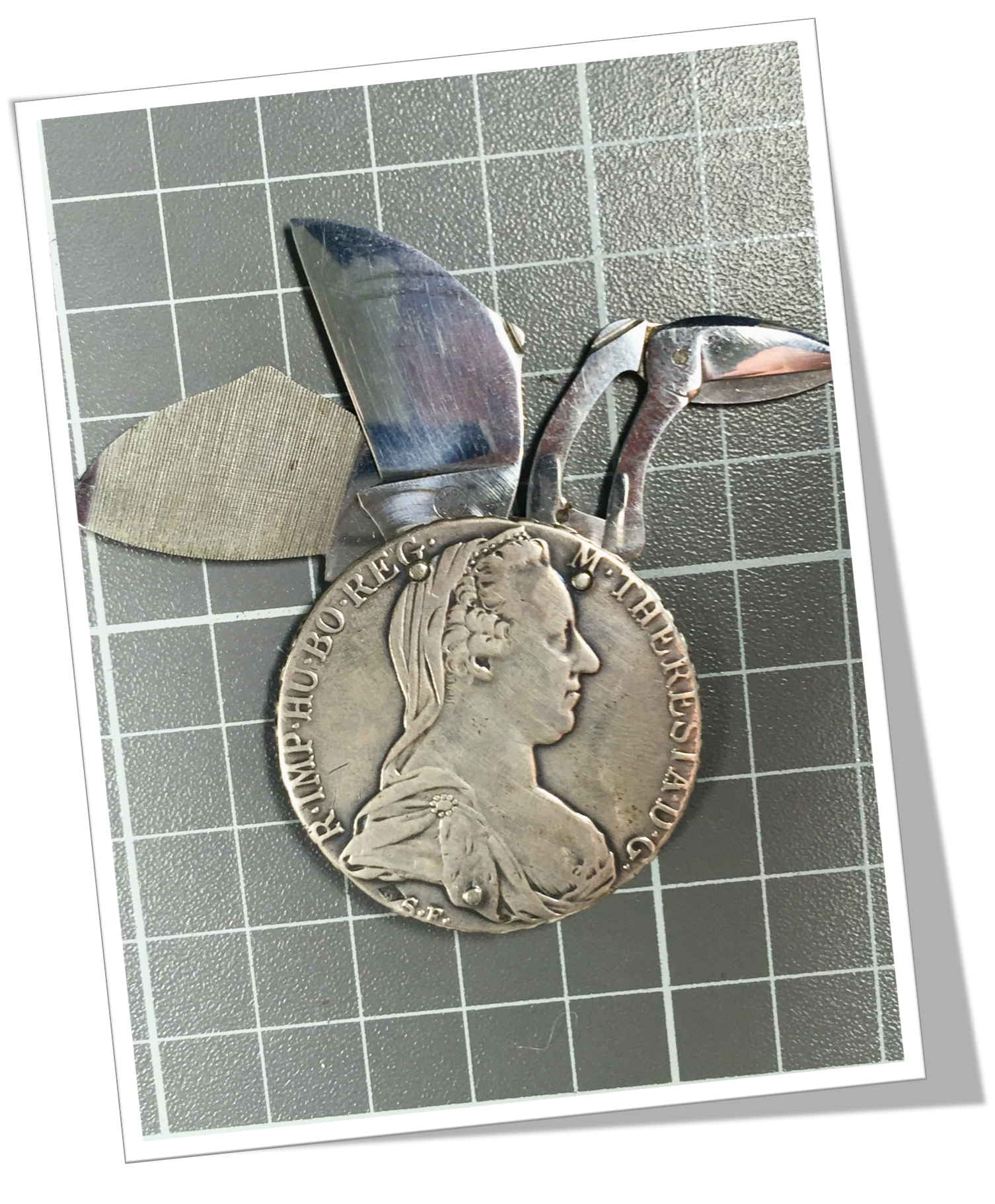 Canif rond Pièce en argent 900, tranchée et rivetée. Marie Thérèse, Autriche 1780.3pcs hautes 3635 Lame droite, lime convexe et ciseaux.