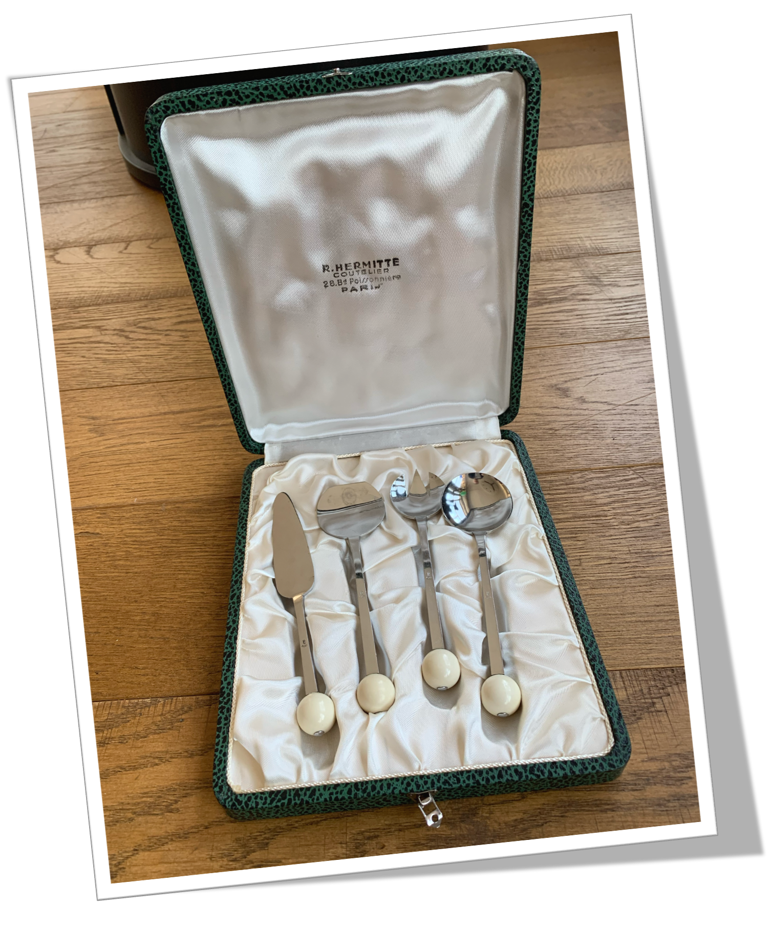 Ménagère couverts à dessert En acier chromé lisse poli miroir, agrémentés de boules en ivoire. Style Art Deco.Coffret de 4pcs: cuillère, fourchette, pelle longue et pelle ronde.
