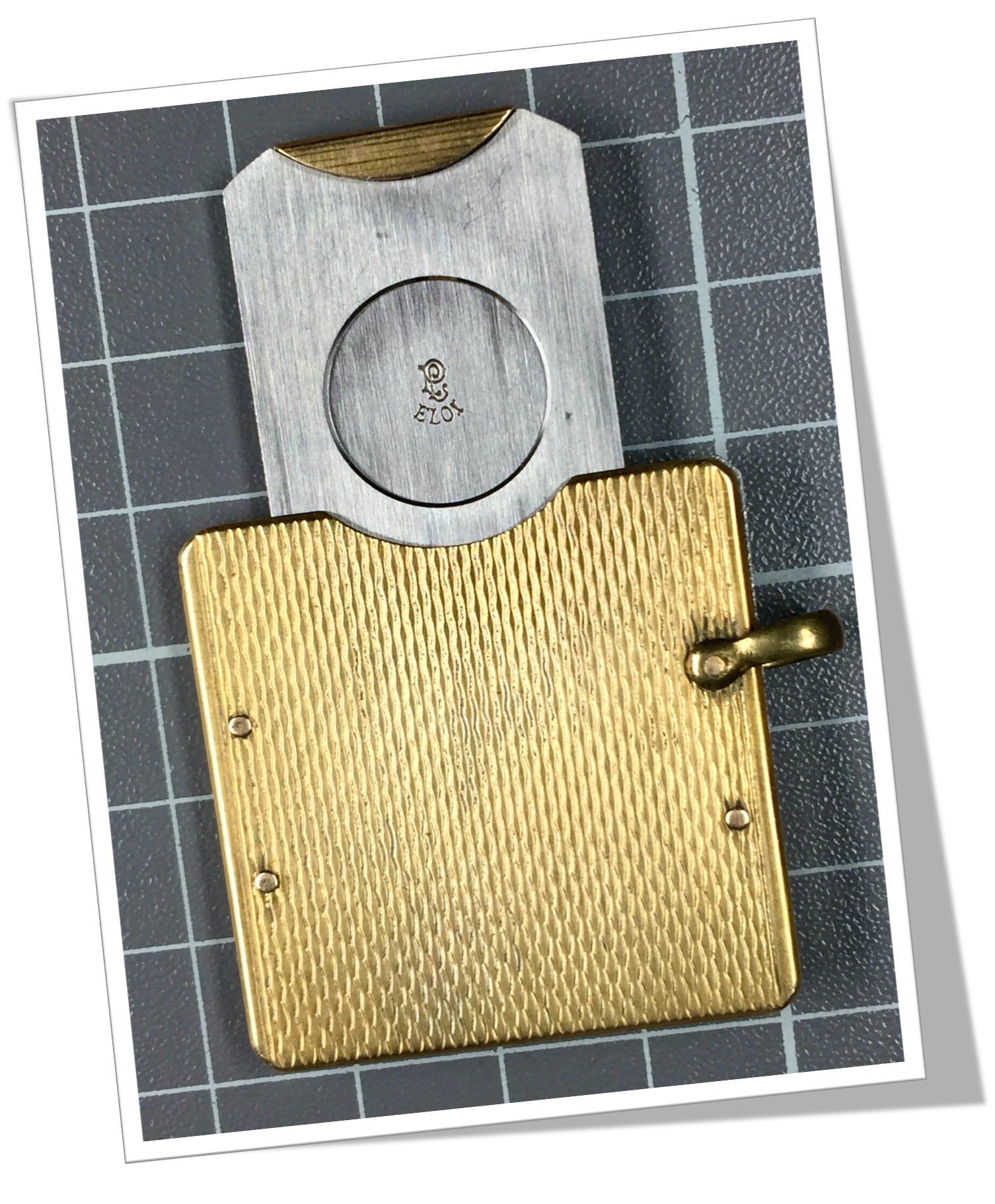 Coupe-Cigare de poche Côtes carrées rivetées en métal doré, rehaussées d’un guillochis « linéaire », agrémenté d’un liseré latéral.Guillotine secrète à tirette. Bélière latérale.