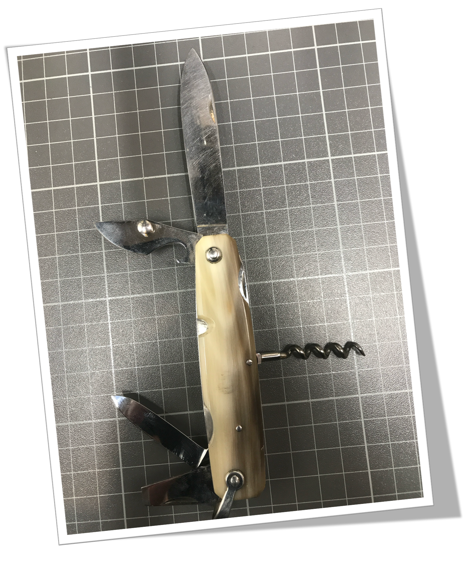 Couteau canif Manche à côtes octogonales rivetées en corne blonde.6pcs: Grande lame, petite lame, ouvre-boîte, pique, tir-bouchon et tourne-vis. Bélière. 19cm.