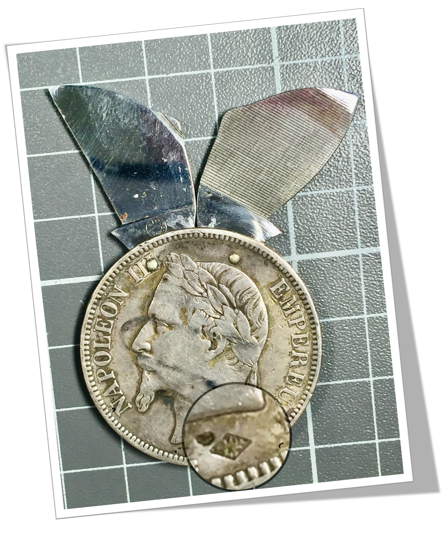 Canif rond Écu en argent 900, tranché et riveté. Napoléon III, France 1868.2 pcs hautes 2635 Lame droite et lime convexe.