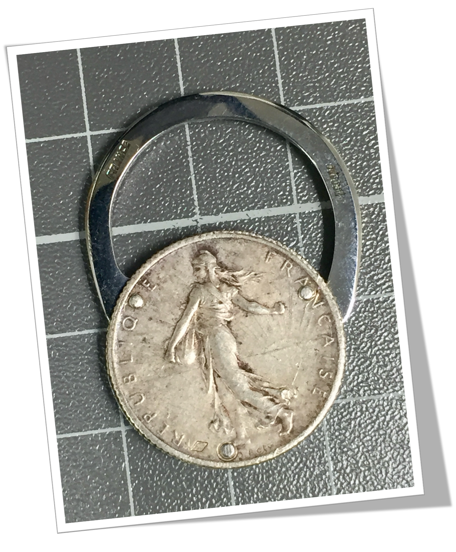 Pièce en argent 900, tranchée et rivetée. Semeuse 1Frs., France 1919.