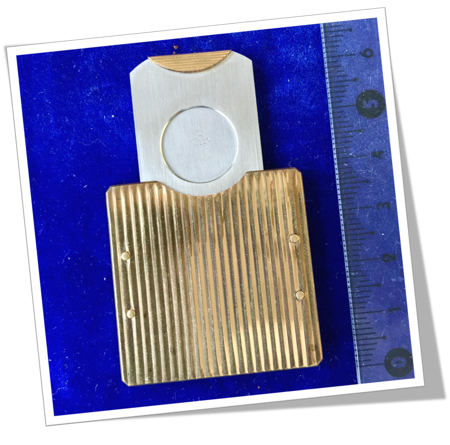 Coupe-Cigare de poche Côtes carrées rivetées en métal doré, rehaussées d’un guillochis « godronné » agrémenté d’un liseré latéral.Guillotine secrète à tirette.