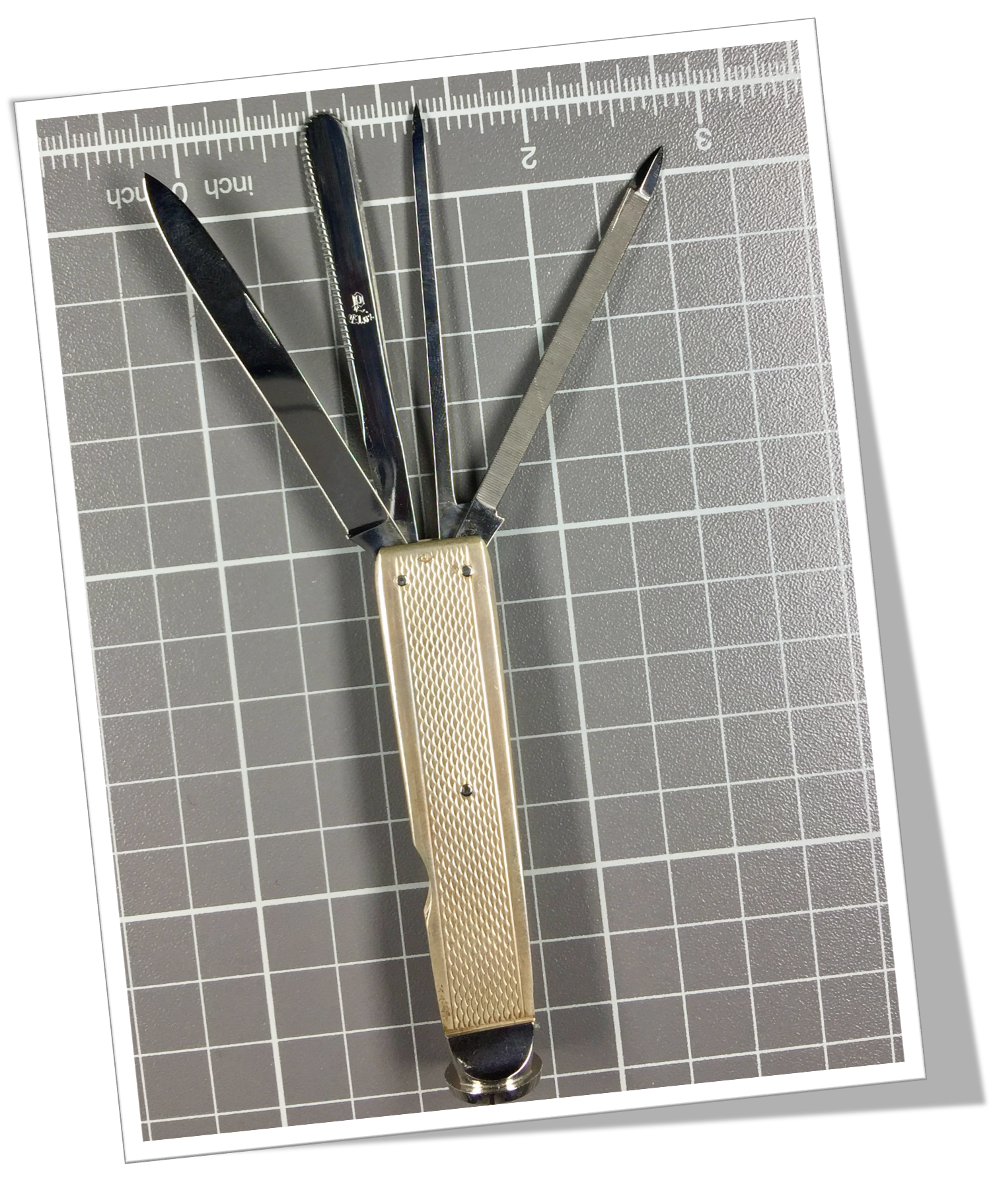 Nécessaire fumeur de pipe Côtes rivetées en argent 925, rehaussées d’un guillochis « linéaire » agrémenté d’un liseré.4pcs+: Grattoir dentelé, pique, lame, lime + Bourre-Pipe tampon en bout de manche.
