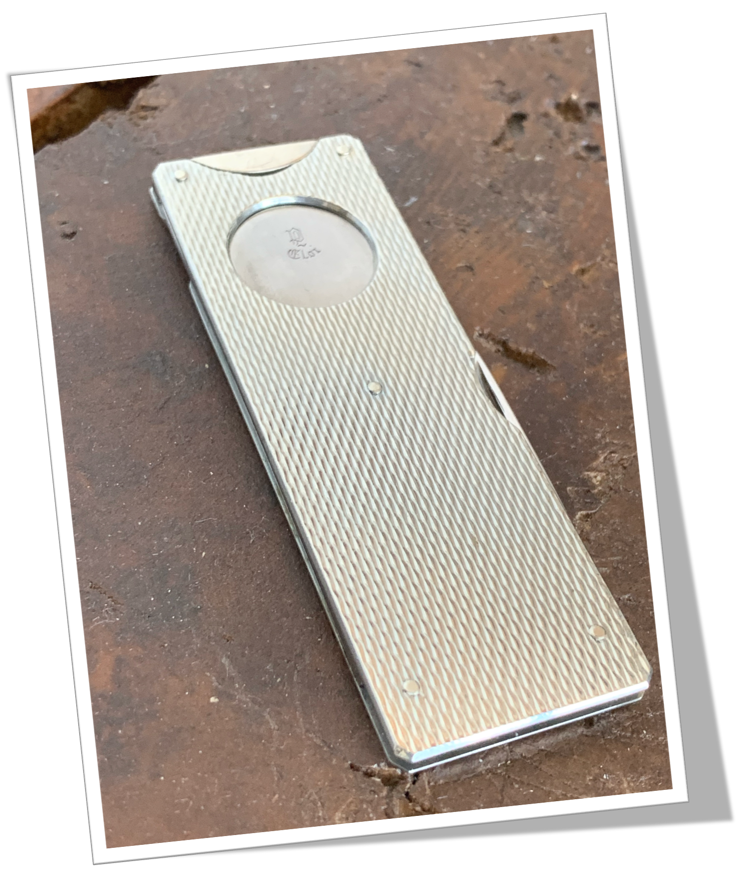Coupe-Cigare de poche Longues côtes rectangulaires rivetées en métal argenté, rehaussées d’un guillochis « linéaire ».Guillotine à tirette +2 rétractables: Lame et pique-poinçon.