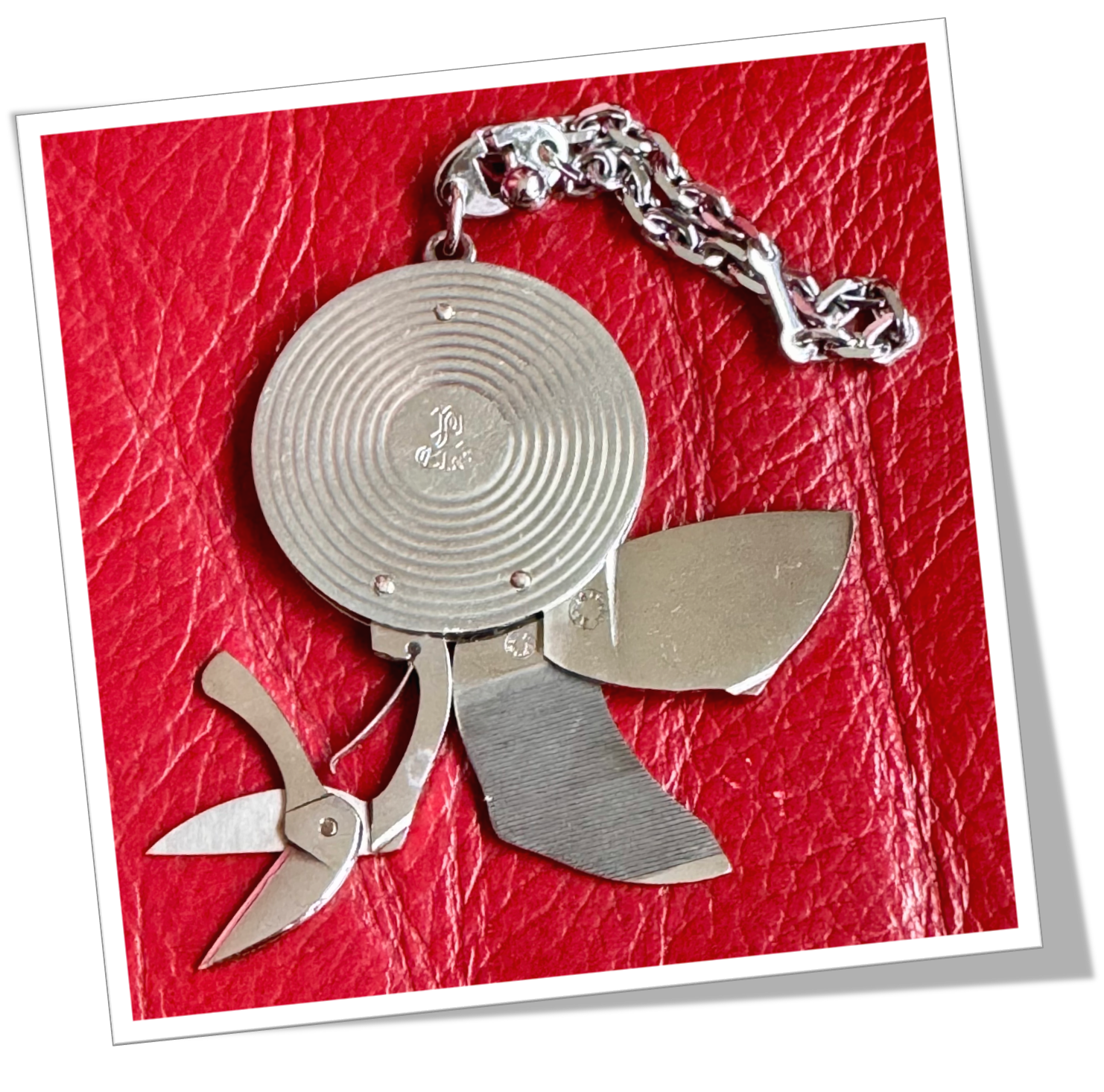 Coin-Knife (onglier) Côtes circulaires rivetées en métal argenté. guillochis « cercles à répétition » avec au centre le marquage LP gothiques et Eloi gothique.3pcs basses 3952 Lame convexe, lime concave et ciseaux. Chaînette.