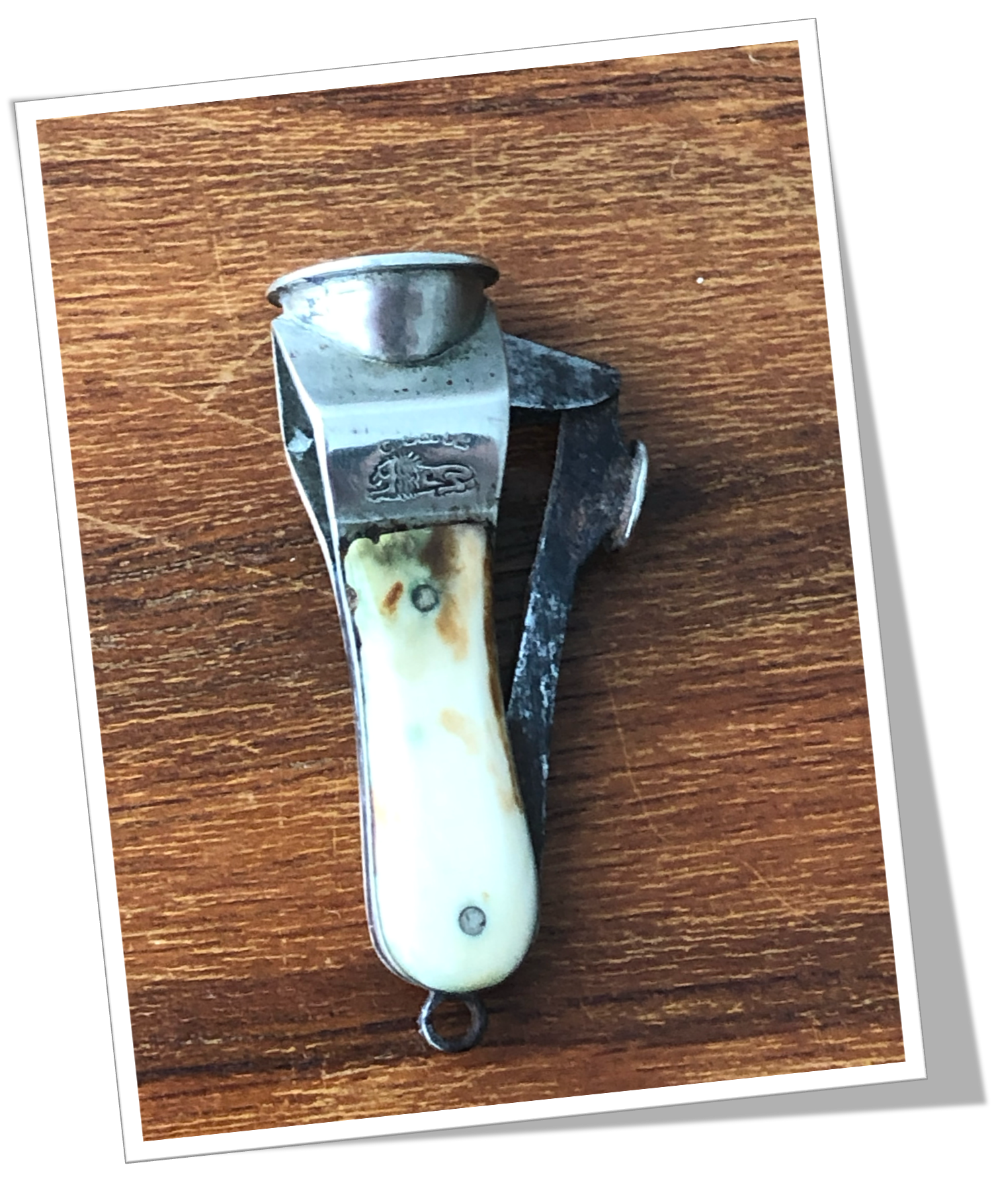 Coupe-Cigare de poche Côtes rivetées en corne bovine. Tête rehaussée d’un lion gravé.En acier. Manche court agrémenté d’une tête ancienne de type Cat-Eye (V-Cut) rehaussée d’un bouton circulaire. Anneau levier. 4cm.