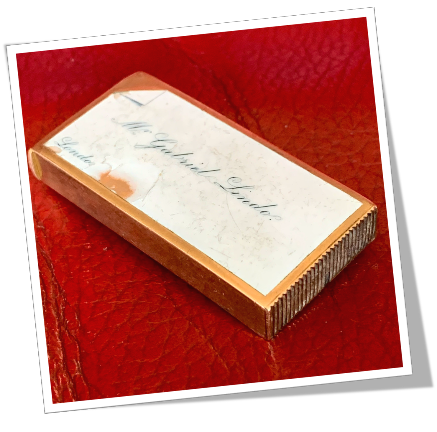 En or 9ct et de forme rectangulaire à angles droits. Lisse poli miroir et agrémenté au recto d’une œuvre émaillée peinte à la main, représentant une carte de visite rehaussée de veinures de marbre et nominative « Mr. Gabriel Lindo, London ». 23,8g