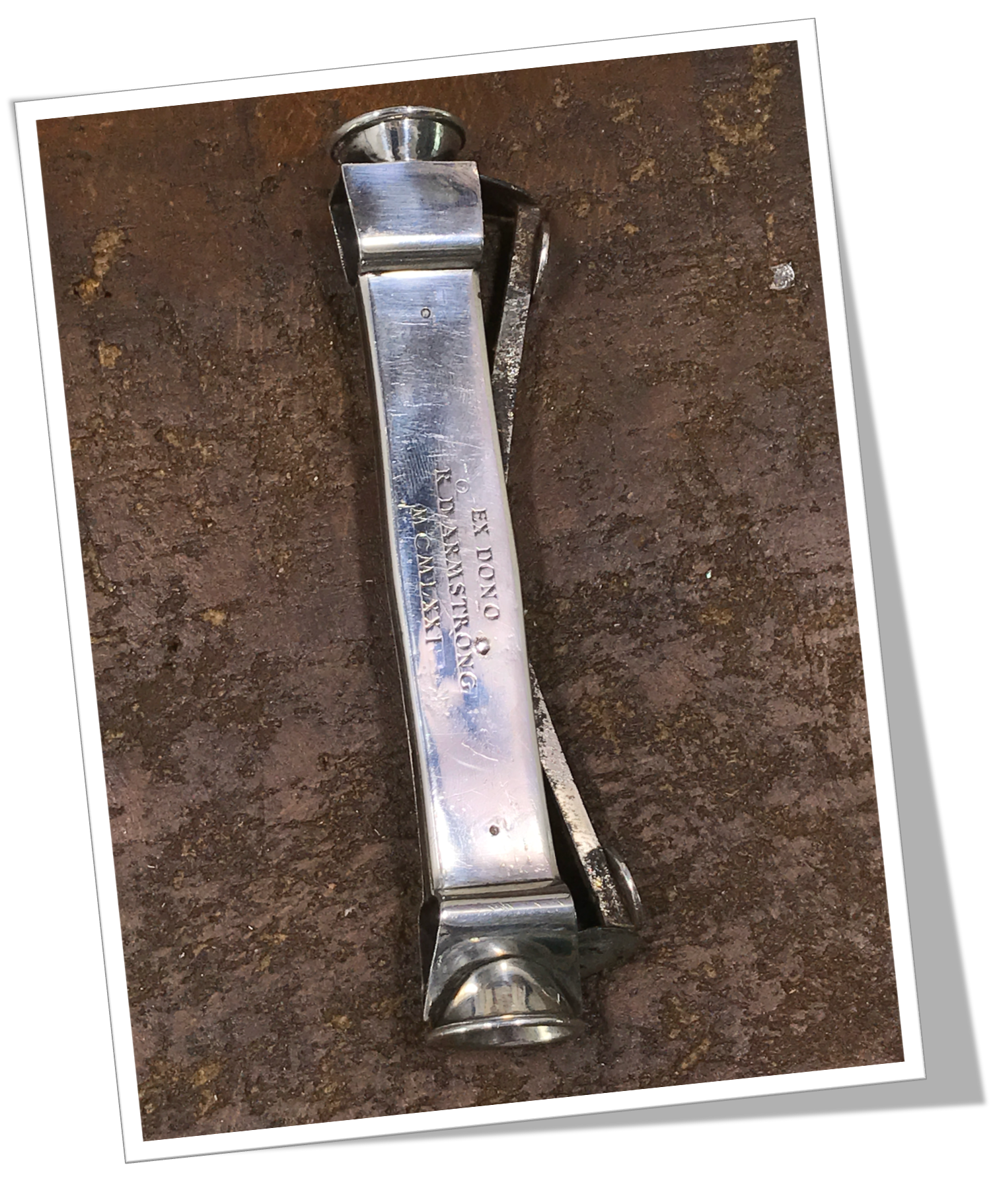 Coupe-Cigare de table Manche à côtes rivetées en argent 925. Lisses avec monogramme « EX DONO R D ARMSTRONG MCMLXXI ».Double tête:. Cat-Eye (V-Cut) et Straight-Cut. Long 13cm.