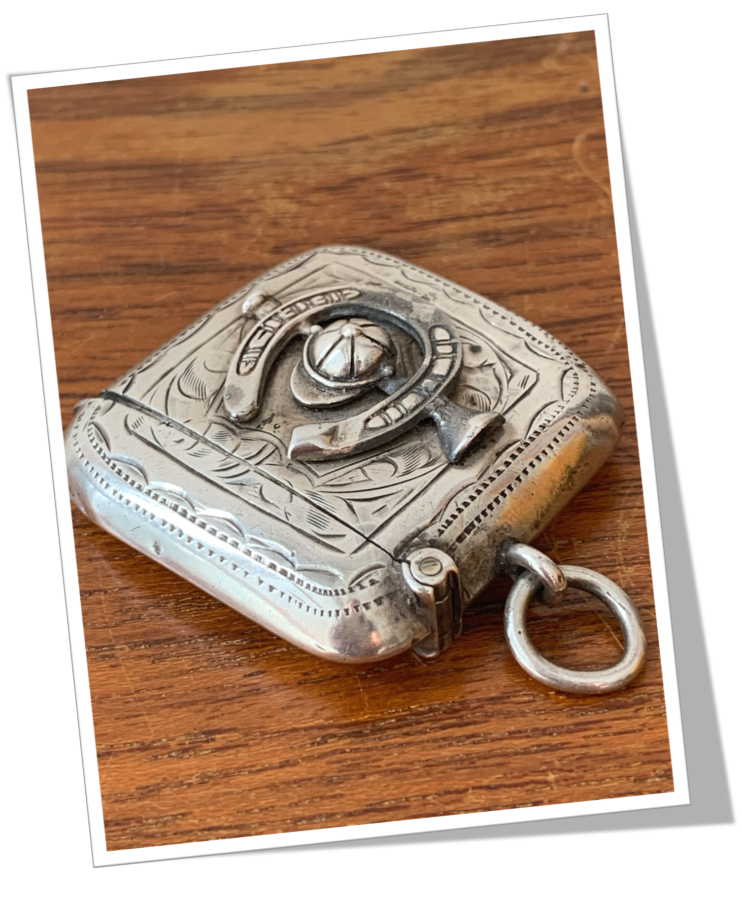 Pyrogène Vesta Case En argent 925 et de forme carré. Rehaussée de feuillage et décor floral gravés, ciselés et agrémentée au recto d’un fer à cheval et casquette de jockeys en technique « repoussé ».Clapet 1/5 4/5 et grattoir concave à la base.