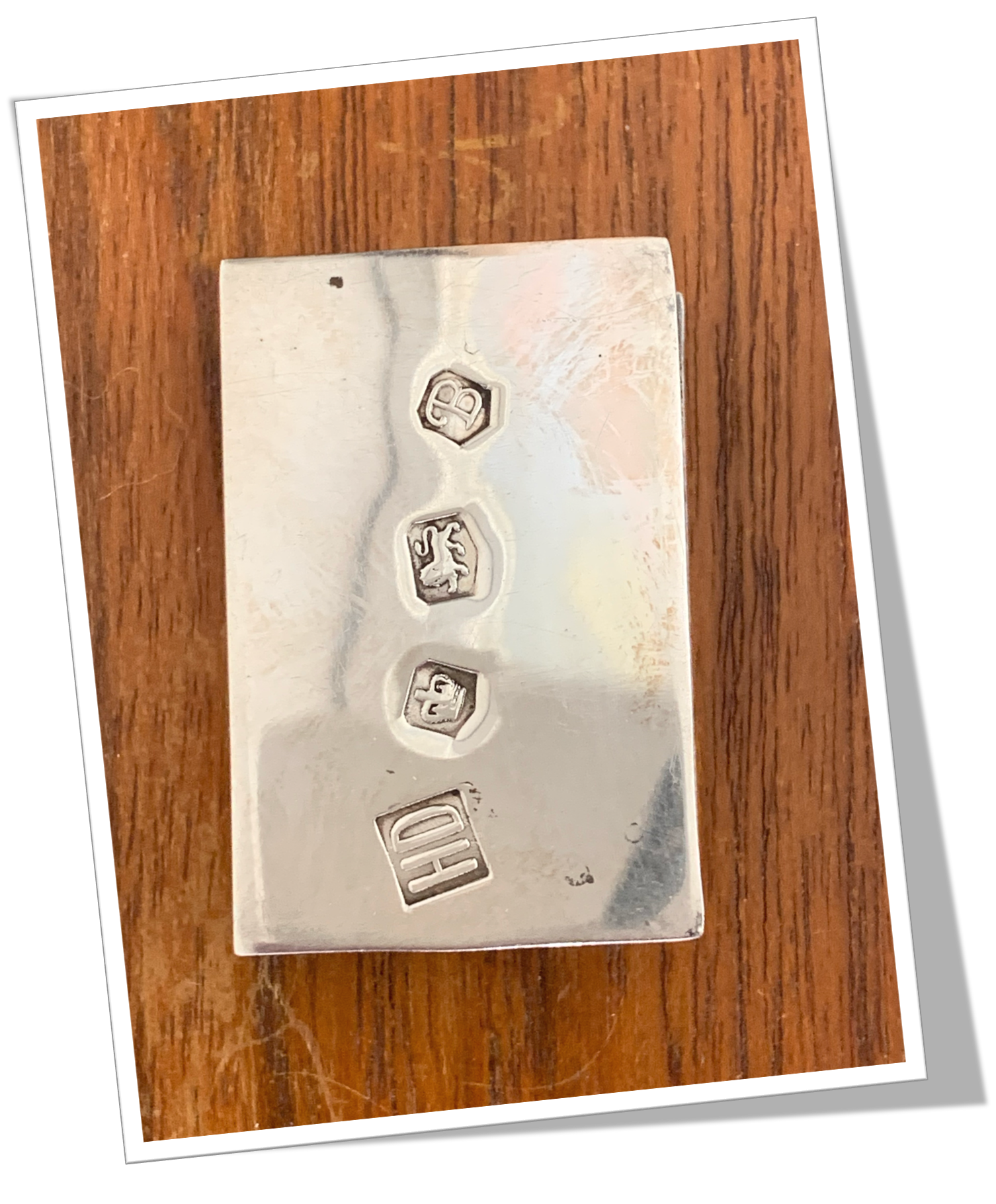 Étui à boîte d’allumettes En argent 925 et de forme rectangulaire à angles droits. Lisse poli miroir, agrémenté au recto de gros poinçons. 16g.Reliure.