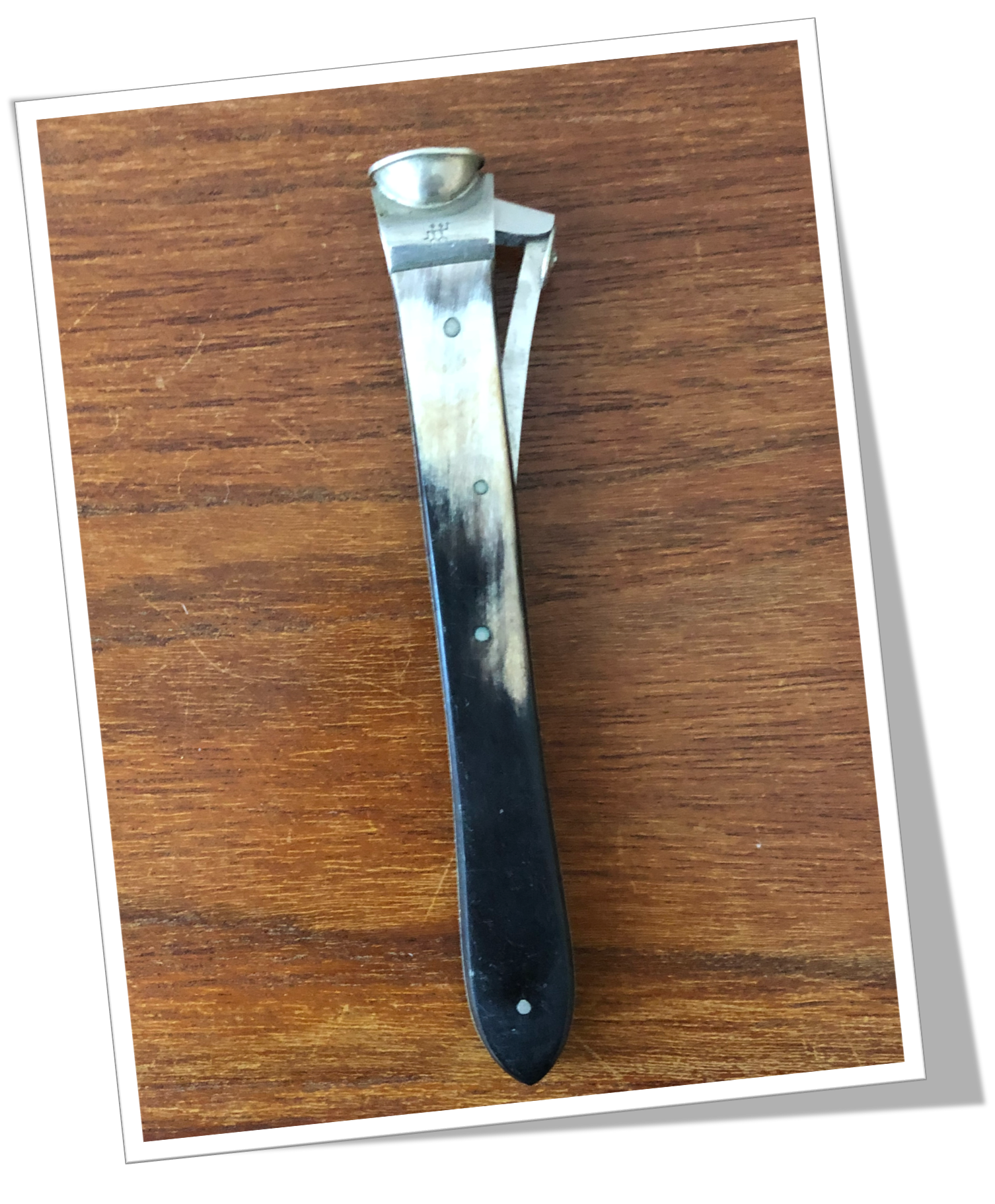 Coupe-Cigare de table Côtes rivetées en corne blonde et noire.Manche long à talon pointu, agrémenté d’une tête ancienne de type Cat-Eye (V-Cut), rehaussée d’un bouton circulaire. 13cm.