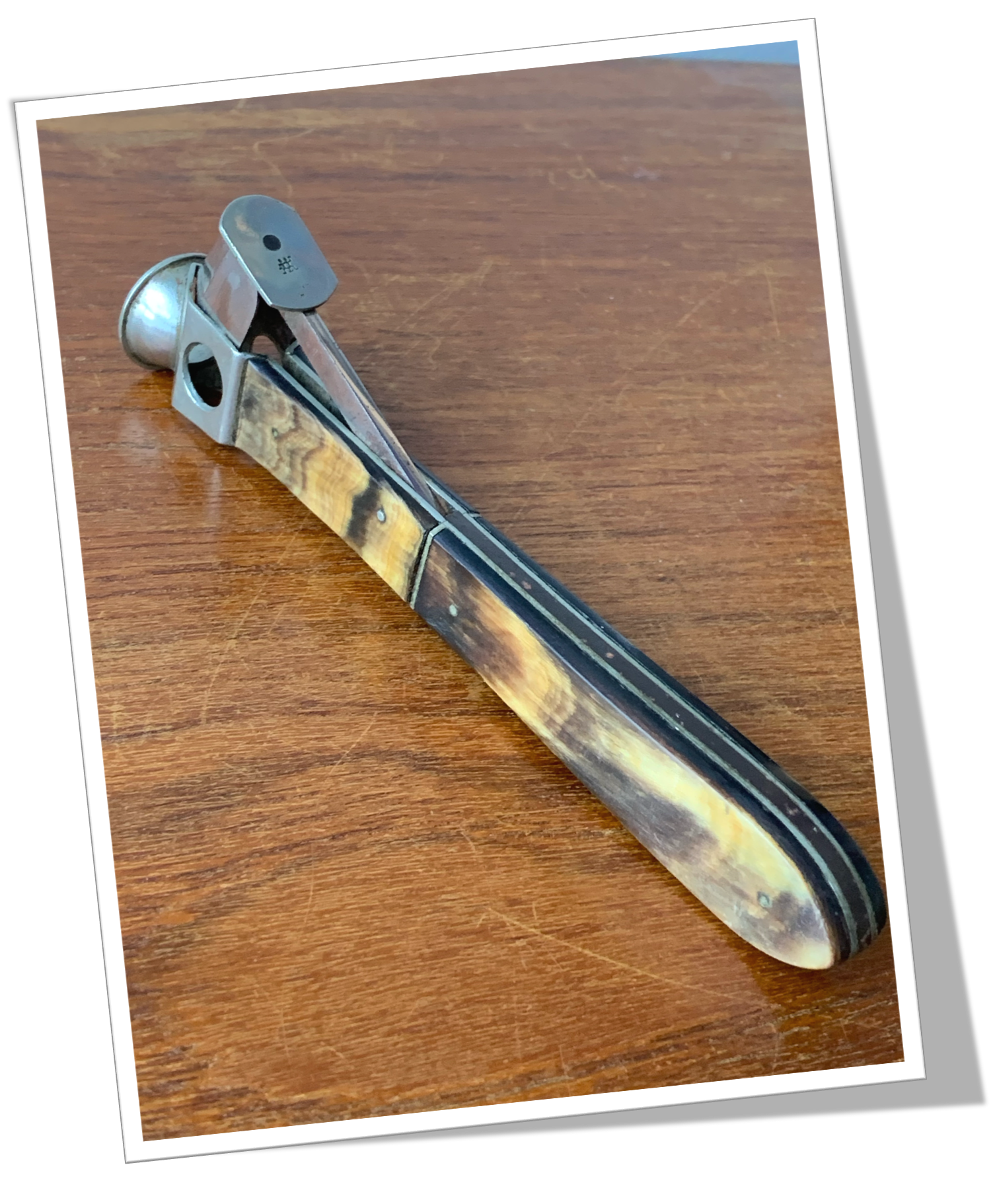 Coupe-Cigare de table Côtes rivetées en corne tigrée.En acier chromé. Manche long agrémenté d’un « pied de biche » et d’une tête transition, de type Cut-Eye (V-Cut) + Straight-Cut. 15cm.