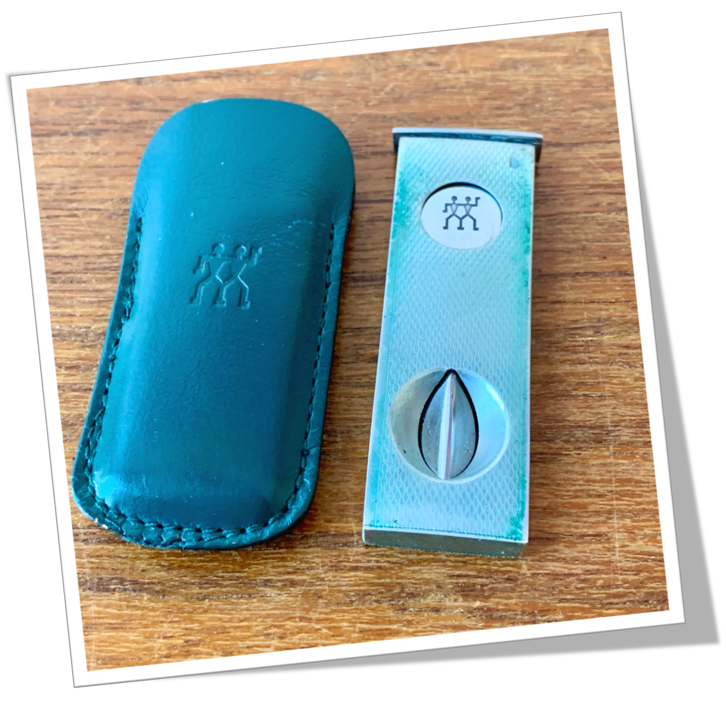 Coupe-Cigare de poche En métal argenté et de forme rectangulaire. Faces rehaussées d’un guillochis «linéaire».Cat-Eye (V-Cat) et guillotine à collerette.