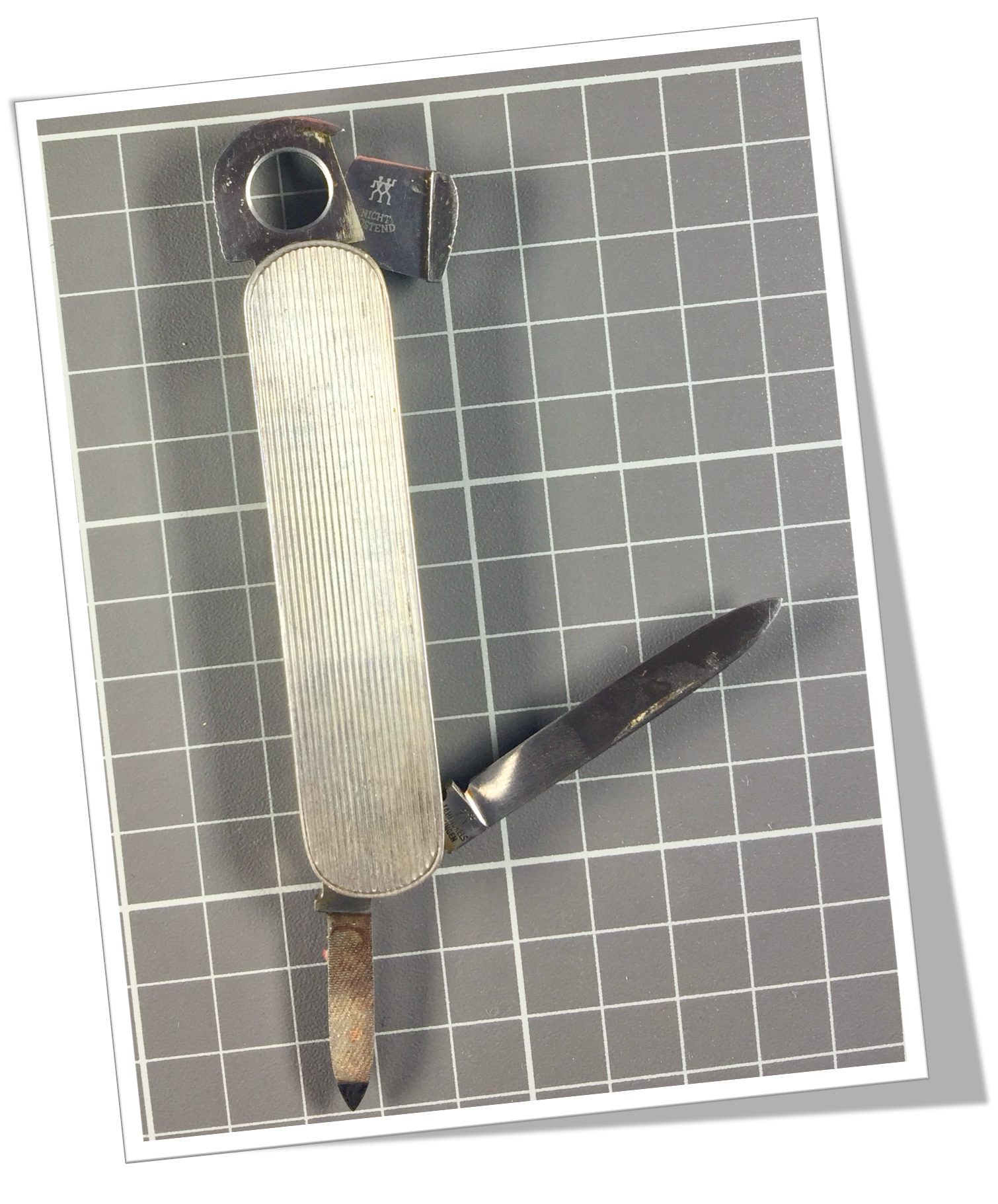 Coupe-Cigare de poche Côtes ovoïdes appliquées en argent 925, rehaussées d’un guillochis « godronné », agrémenté d’un liseré.En acier chromé. Manche court agrémenté d’une guillotine extractible +2pcs: Lame et lime rétractables. 8cm.