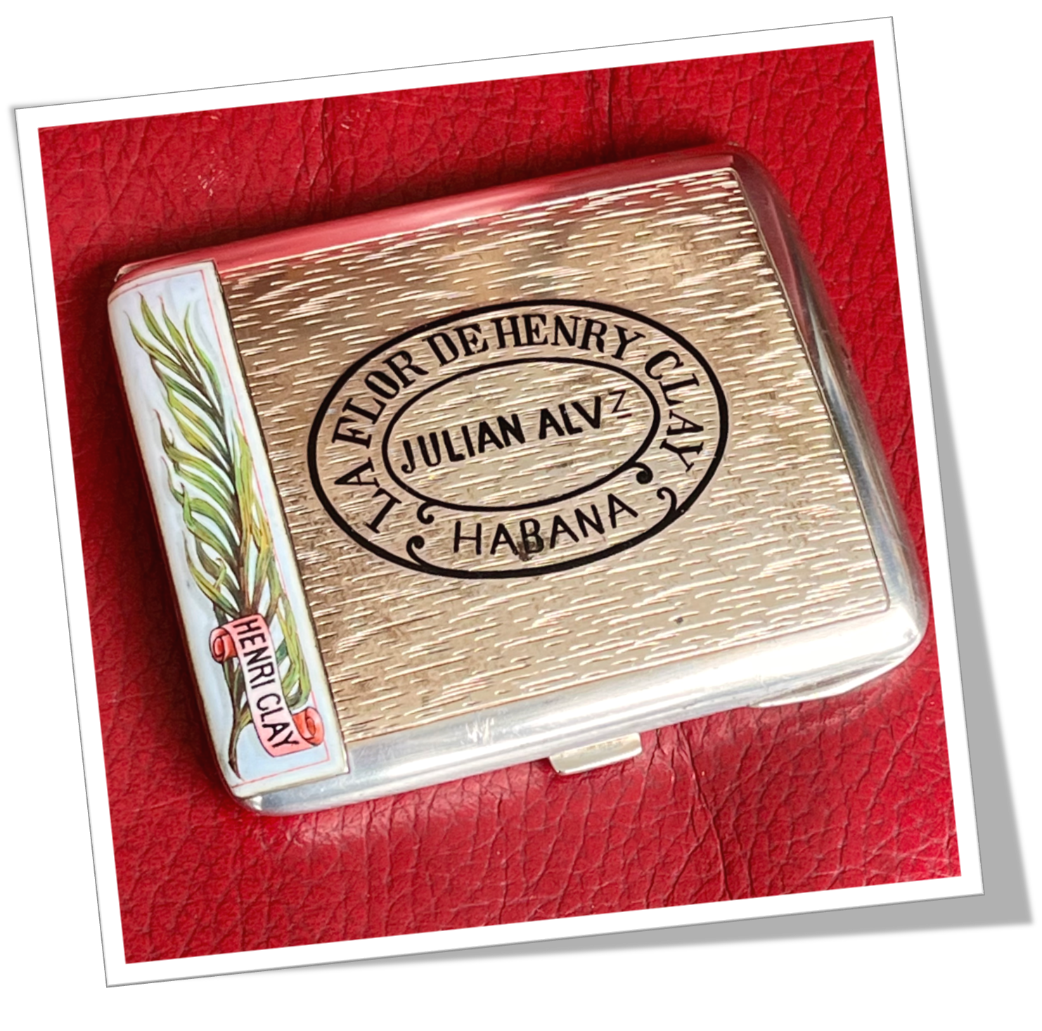 Étui à cigarettes En argent 925 et de forme rectangulaire. Rehaussé d’un fond tramé façon « tronc d’arbre », agrémenté au recto en son centre du sceau émaillé noir de la fabrique de cigares, « La Flor de Henry Clay, Habana – Julian Alvarez » et d’une plaque émaillée ornée dune œuvre polychrome, représentant une branche de palmier et du parchemin volant à l’inscription, « Henry Clay ». 122grCapot à charnière 1/2 1/2.