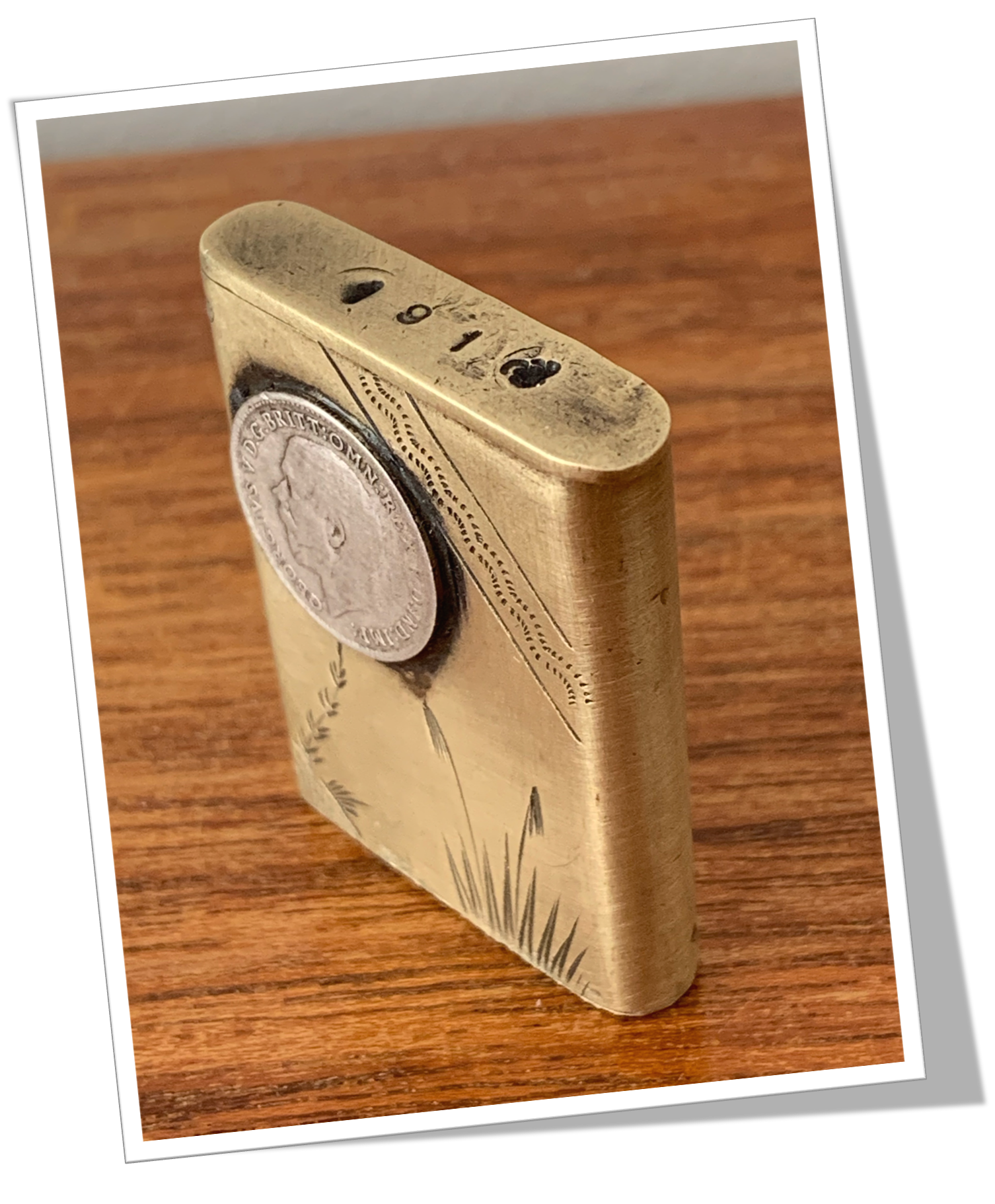 Pyrogène Vesta Case En laiton et de forme rectangulaire à bords arrondis, rehaussé . Rehaussé au recto d’un décor gravé de style japonisant et agrémenté d’une pièce de monnaie anglaise en argent, George V, appliquée au dessus d’un buisson et plantes sur plan d’eau.Clapet à zéro et grattoir plat à la base.