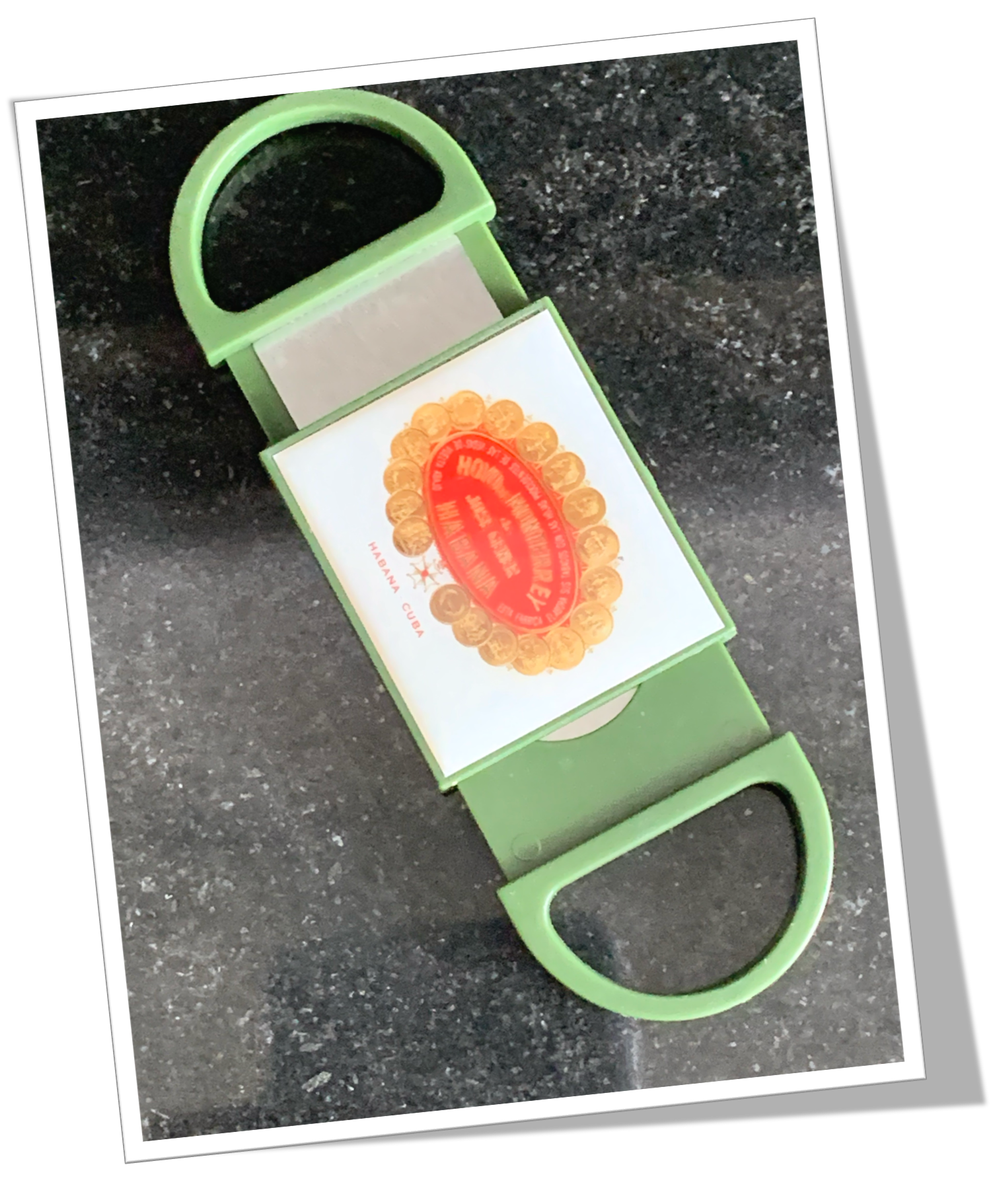 Coupe-Cigare de poche En résine de couleur verte, agrémenté au recto d’une sérigraphie polychrome, sous plastique translucide.Double prise semi-circulaires latérales. Hublot obstrué à l’avant. Double guillotine nichée à l’arrière. 8cm.