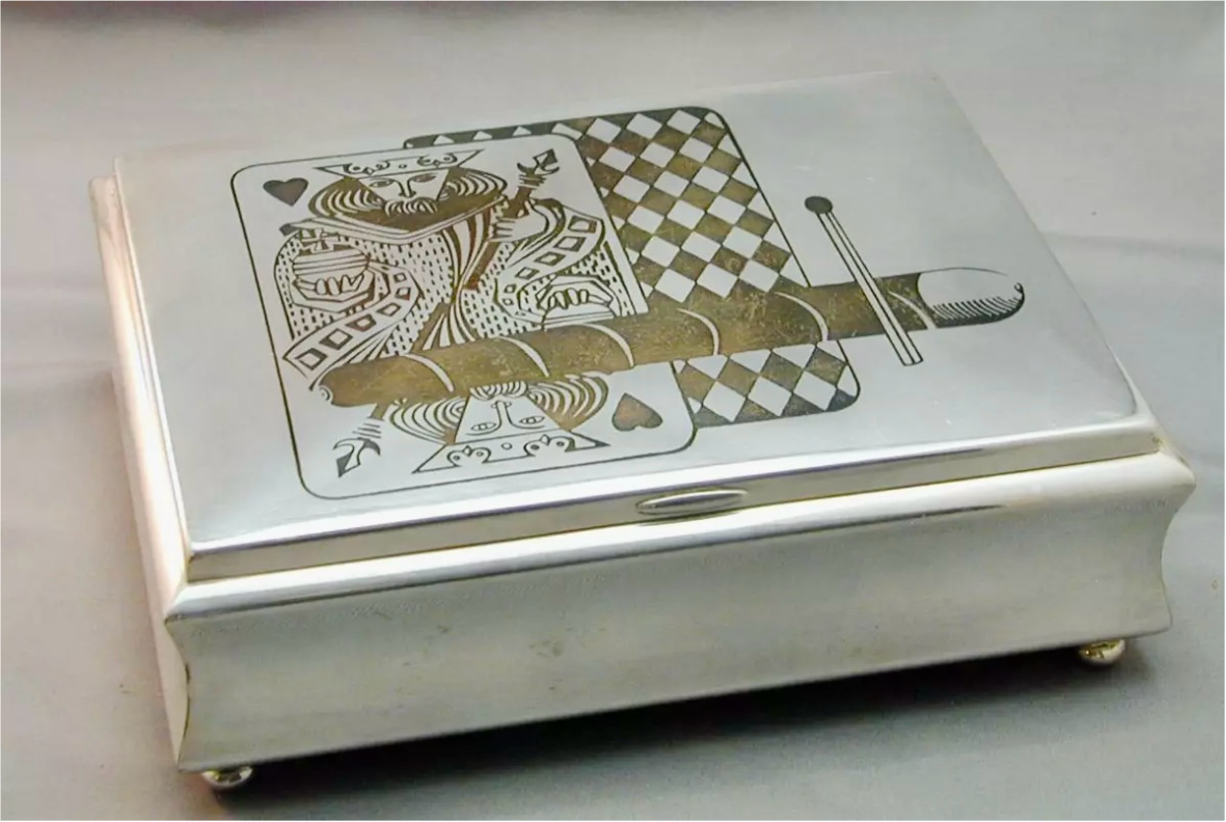 Boîte de bureau à cigarillos En métal plaqué argent et de forme rectangulaire, rehaussé au recto d’une œuvre monochrome couleur bronze, représentant une carte à jouer du Roi de Coeur et son verso jacquard en losange, agrémenté d’un cigare et d’une allumette. Capot 1/5 4/5. Barre frontale de soulèvement. 4 pattes boules.